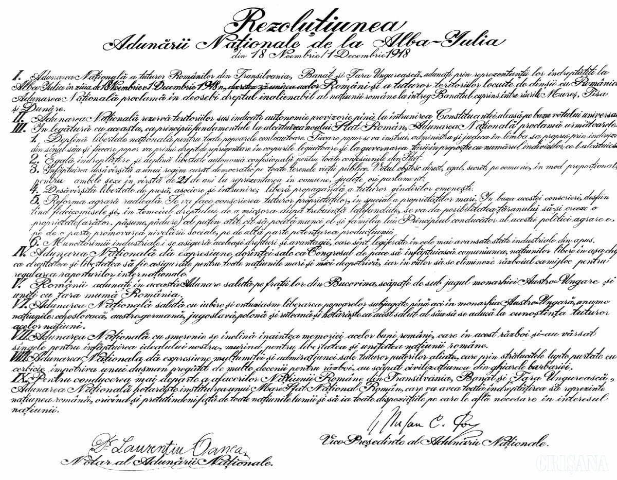 Hotărârea de unire a Transilvaniei cu România, adoptată la 1 Decembrie 1918, cuprinde nouă puncte, care au în centrul lor următoarele idei: