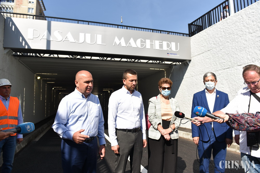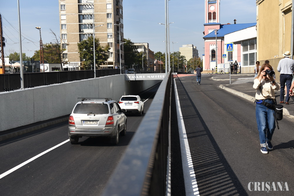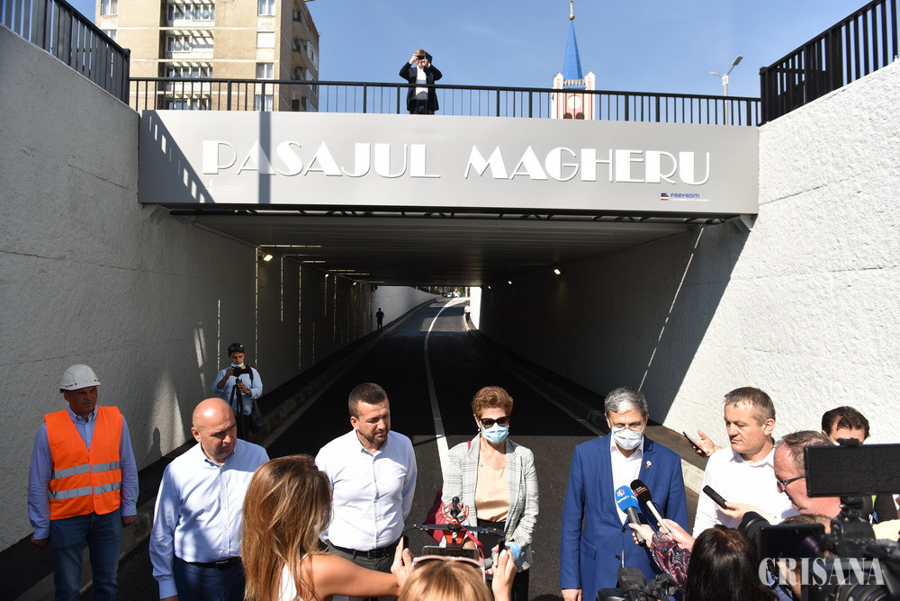 Deschiderea oficială a Pasajului rutier subteran Magheru a avut loc azi, la eveniment participând ministrul Fondurilor Europene, Marcel Boloş, primarul Ilie Bolojan şi viceprimarii Florin Birta şi Mircea Mălan. Pasajul a fost construit din fonduri europene, cu scopul de a fluidiza circulaţia autovehiculelor şi a tramvaielor în intersecţia Bulevardului Magheru cu străzile Aleea Ştrandului şi Parcul Traian. Lucrarea a cuprins şi lărgirea podului Dacia la trei benzi pe sens şi reabilitarea acestuia. Proiectul a fost executat de asocierea de firme formată din: Freyrom (lider de asociere), Procons Group (asociat), Integrated Road Solutions (asociat), Electro Excel Green Consulting (asociat) și Abed Nego (terț susținător). Valoarea contractului a fost de 14.511.433, 94 lei (fără TVA), dar, potrivit viceprimarului Birta, „mai sunt nişte costuri suplimentare”. Finanţarea a fost asigurată din fonduri europene. Pasajul subteran are două rampe de acces: cu lungimea de 102,27 m spre Parcul Traian şi 88,35 m spre Aleea Ştrandului. Aceste rampe asigură tranziţia de la suprafaţă la cota -4,33 m sub pasaj. Lungimea pasajului care trece pe sub Bulevardul Magheru este de 34,04 m. Împreună cu rampele, lungimea totală a pasajului este de 224,65 m.