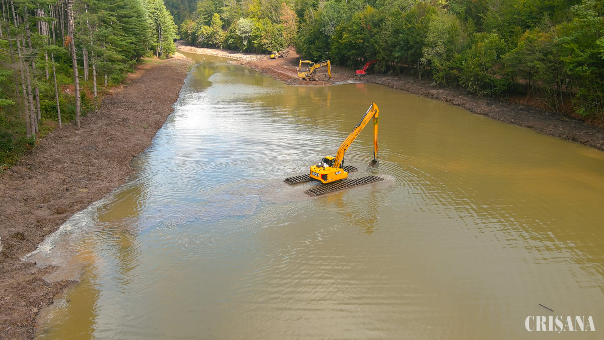 „În momentul când am început, lacul era colmatat total, pe o lungime de 500 de metri. Utilajele sunt scoase o dată la două zile din apă. Nu mai avem productivitate dacă le scoatem în fiecare zi. Le facem plinul la două zile și ele stau două zile cu program prelungit”, a declarat Daniel Forțiu, managerul firmei Vest Build.