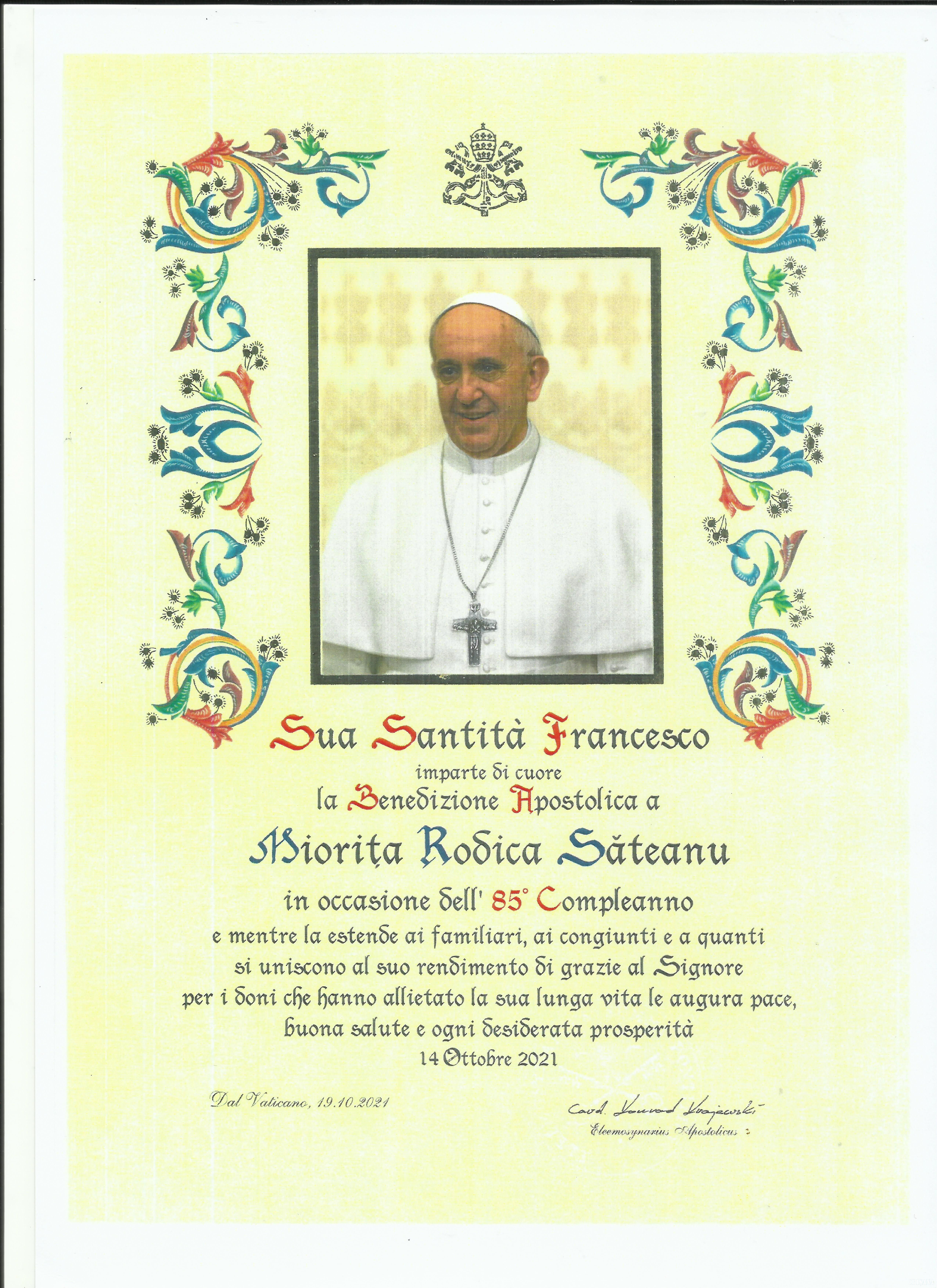 La împlinirea frumoasei vârste de 85 de ani, Miorița Săteanu, cetăţean de onoare al municipiului Oradea și unul dintre cei mai implicați și activi membri ai comunității, a primit o felicitare specială din partea Sanctităţii Sale Papa Francisc.