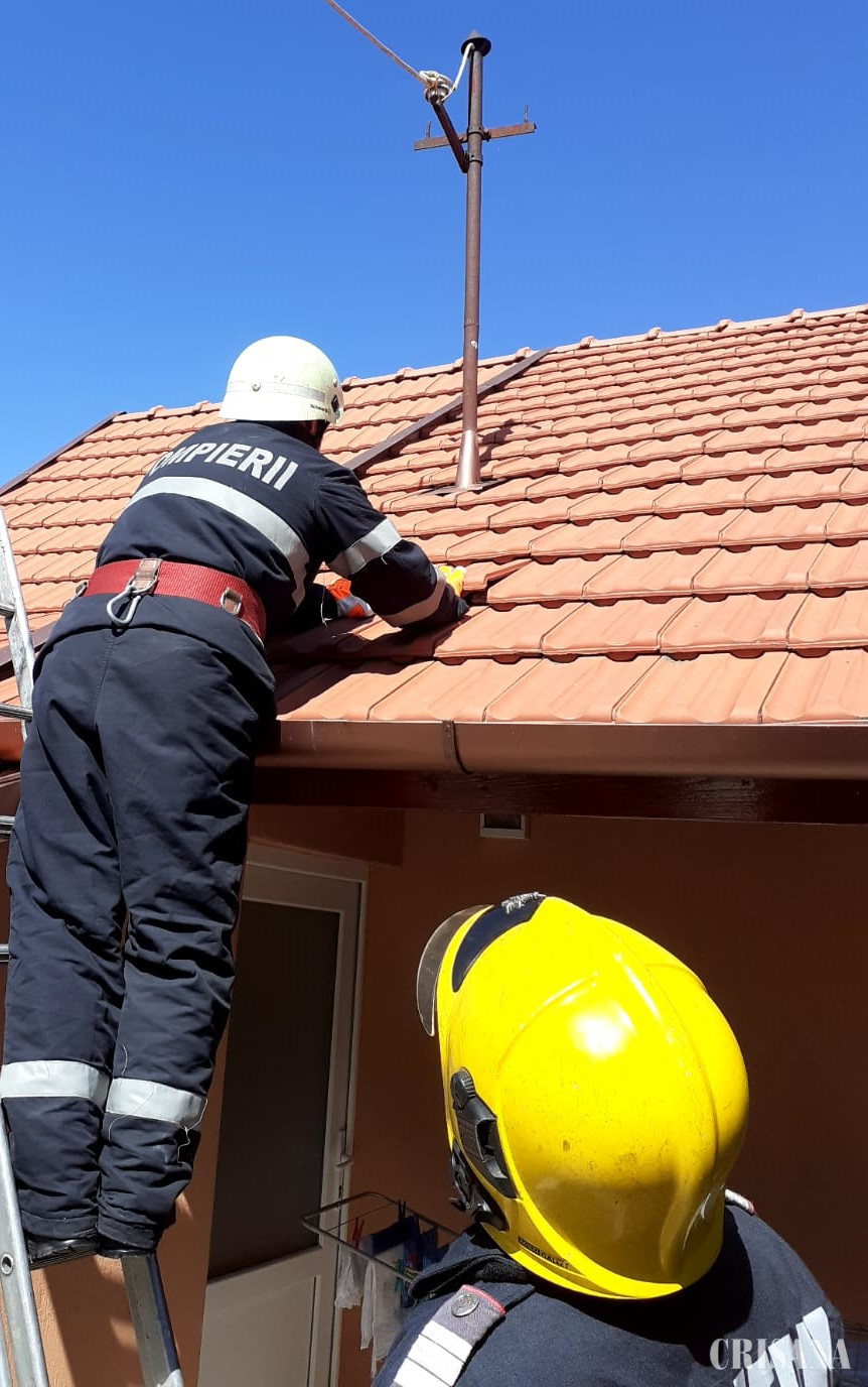 Utilizând scara, unul dintre membrii echipajului de pompieri mobilizați la fața locului a urcat la nivelul acoperișului, a creat o cale de acces în zona în care se auzeau sunetele și a evacuat, în siguranță, puiul de câteva zile, predându-l proprietarei.