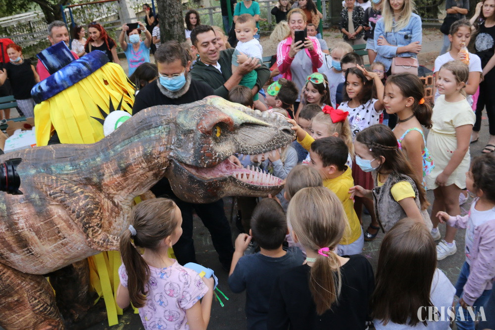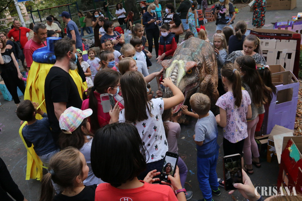 După cele două săptămâni de workshop-uri, vineri, în Parcul Libertății, a fost inaugurat Orășelul de hârtie, cu blocuri de înălțimi diferite, pictate și desenate de copii. La inaugurare a fost prezent și un dinozaur de peste patru metri lungime, destul de năzdrăvan și greu de strunit. Dinozaurul a învățat, alături de spectatori, care sunt bunele maniere la teatru, însă Dino va mai avea și alte lecții de bune maniere de învățat și-și va da întâlnire cu copiii weekend de weekend, în parc, în următoarele săptămâni.