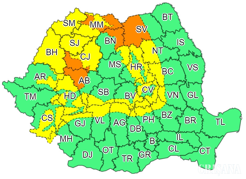 Tot joi între orele 12.00 – 23.00 este cod portocaliu în nordul Carpaților Orientali și în Munții Apuseni. La altitudini de peste 1700 m, în nordul Carpaților Orientali și în Munții Apuseni vântul va sufla tare, cu rafale de peste 110...120 km/h, va fi viscol puternic, zăpadă troienită și vizibilitatea foarte redusă.