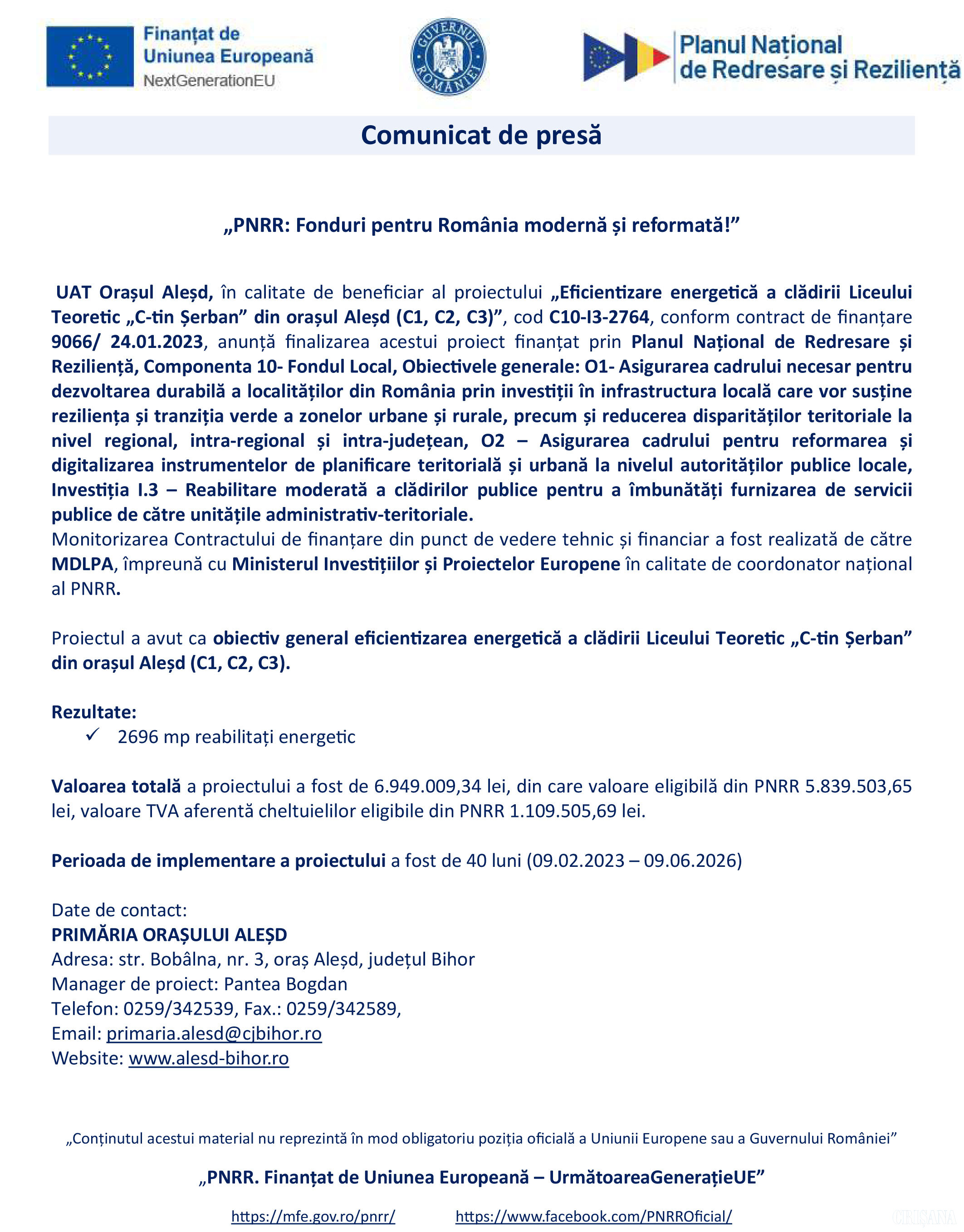 Comunicat de presă al UAT Aleșd, finalizare proiect LT C-tin Șerban 05 Februarie 2026 61 1 0 Advertorial