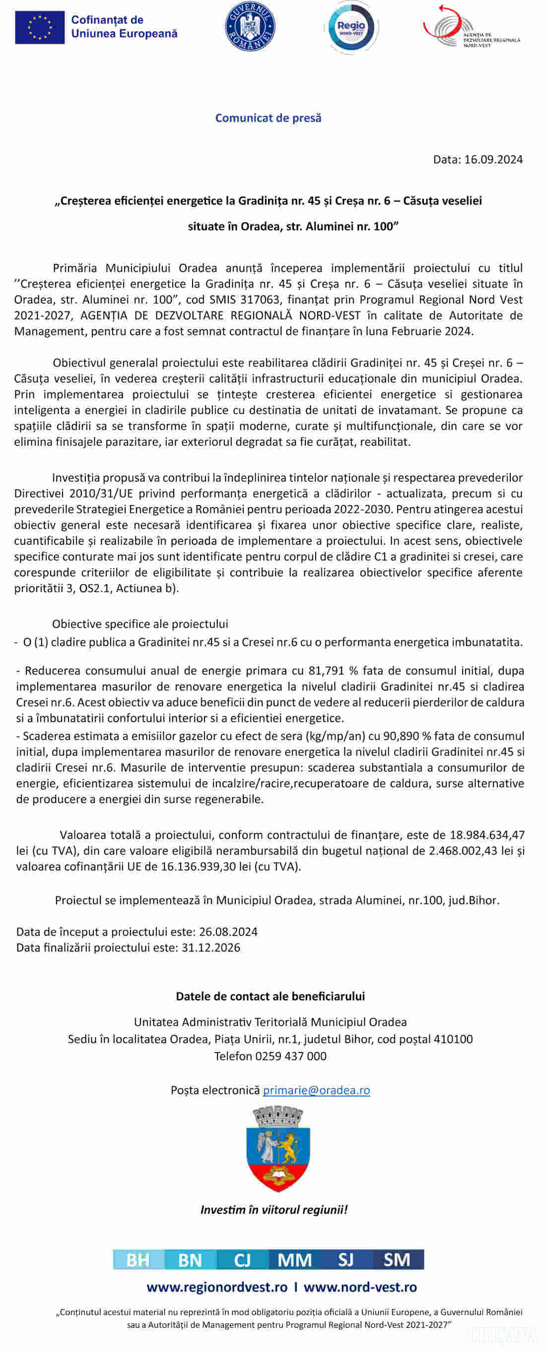 Creșterea eficienței energetice la Gradinița nr. 45 și Creșa nr. 6 - Căsuța veseliei 16 Septembrie 2024 161 1 0 Advertorial