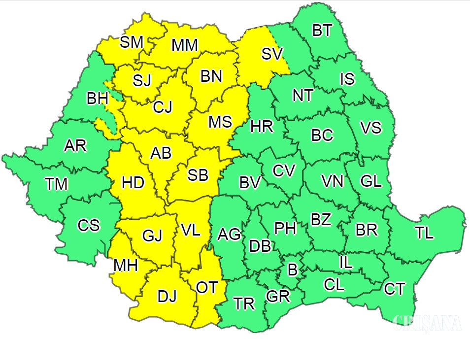 Alerta vizează județele Satu Mare, Maramureș, Sălaj, Bihor, Cluj, Bistrița-Năsăud, Suceava, Mureș, Alba, Hunedoara, Sibiu, Vâlcea, Gorj, Mehedinți, Dolj și Olt.