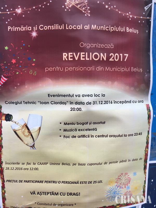 Printre punctele de pe ordinea de zi a ședinței extraordinare a Consiliului Local Beiuș s-a aflat și „Proiectul de hotărâre privind aprobarea organizării evenimentului „Revelionul pensionarilor” la data de 31 decembrie 2016, la cantina Colegiului Tehnic „Ioan Ciordaș” Beiuș”.