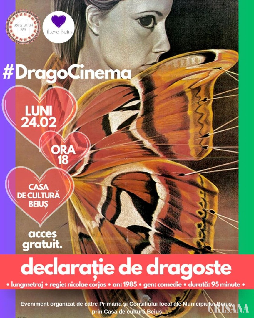 Manifestările cultural-artistice dedicate Dragobetelui continuă luni, 24 februarie, când, tot la Casa de Cultură „Ioan Ciordaș”, beiușenii vor putea viziona cunoscutul film „Declarație de dragoste”, apărut în 1985, în regia lui Nicolae Corjos și cu o distribuție din care, alături de tinerii protagoniști Teodora Mareș și Adrian Păduraru, făceau parte actori consacrați precum Tamara Buciuceanu și Ion Caramitru.