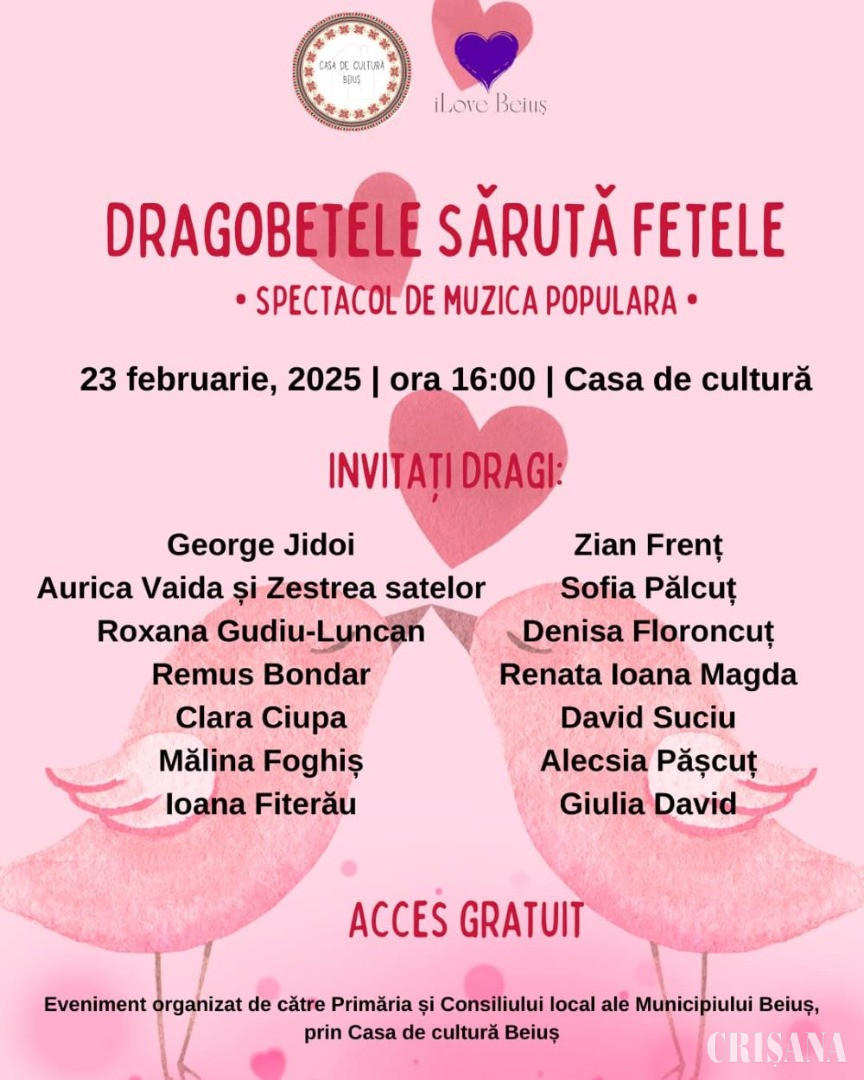 Duminică, 23 februarie, începând cu ora 16.00, Casa de Cultură Beiuș va găzdui evenimentul intitulat „Dragobetele sărută fetele!” Conform paginii de Facebook a Casei de Cultură Beiuș, este „un spectacol de muzică populară dedicat iubirii, cu interpreți de-ai noștri, îndrăgiți”: George Jidoi, Aurica Vaida (împreună cu „Zestrea satelor”), Roxana Gudiu-Luncan, Remus Bondar, Clara Ciupa, Mălina Foghiș, Ioana Fiterău, Zian Frenț, Sofia Pălcuț, Denisa Floroncuț, Renata-Ioana Magda, David Suciu, Alecsia Pășcuț și Giulia David.