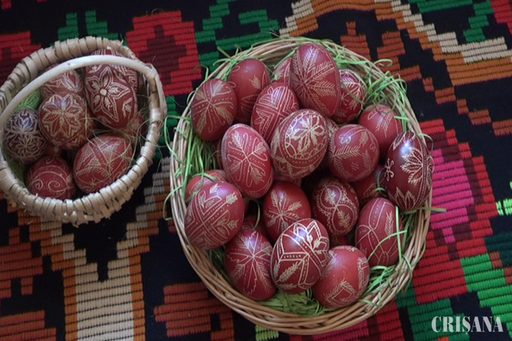 După ce s-au făcut ouăle cu ceară, le punem la fiert, în vopsea. La noi, în zonă, obişnuită este vopseaua roşie, reprezentând Sângele Mântuitorului. Ştim că Sfânta Sa Mamă a pus la picioarele Lui un coş cu ouă şi sângele Lui a căzut pe ouă şi le-a înroşit. De aici, tradiţia de a avea ouă roşii de Paşti. Se pun coji de ceapă şi se fierb până când începe să meargă ceară. Se scot, se curăţă şi, după ce sunt toate curăţate de ceară, se dau cu slănină, pentru a prinde luciu.”