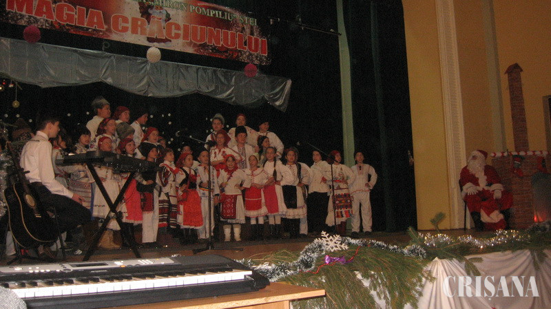 Spectacolul intitulat „Magia Crăciunului” a avut două părţi. Prima a debutat cu o surpriză. Profesorii Şcolii Gimaziale „Miron Pompiliu” Ştei au colindat, impresionând audienţa. Supriza a fost întregită de apariţia lui Moş Crăciun cu spiriduşii săi, cel pe care prichindeii l-au aşteptat cuminţi tot anul. Primii care i-au dovedit moşului talentul au fost elevii clasei pregătitoare A, care, coordonaţi de prof. Alina Todor, au adresat publicului urarea „La mulţi ani”. Prinşi în horă, aceştia au dovedit că talentul nu are vârstă. Au urmat apoi elevii clasei pregătitoare B, care şi-au dovedit măiestria în ale colindatului prin două cântece cu tematică religioasă, coordonaţi de prof. Dana Colf.