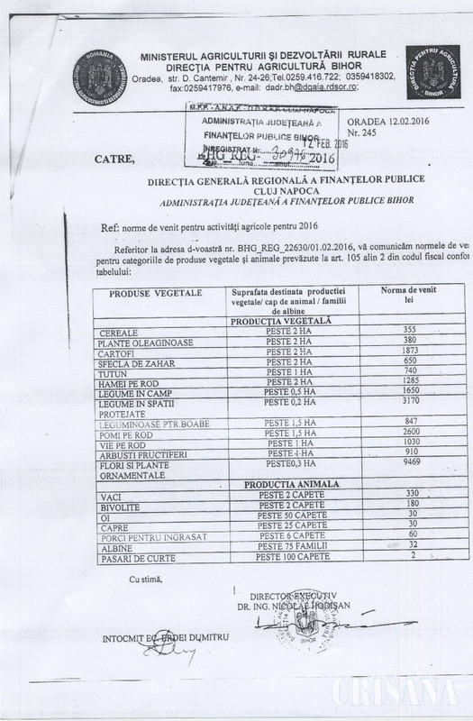 "Dacă la întâlnirea programată pe 10 februarie cu reprezentanţii asociaţiilor pentru stabilirea normei de venit pe 2016, aceştia s-ar fi prezentat cu propuneri scrise şi fundamentate şi nu doar discuţii din care a reieşit dorinţa de a impune o cotă a normei de venit de zero lei, cu argumente care nu se regăsesc şi în realitate, am fi putut ţine cont de aceste propuneri”, se arată în răspunsul adresat Crişanei de către directorul Nicolae Hodişan. Acesta arată că instituţia pe care o conduce are "o reală înţelegere privind doleanţele fermierilor, în acest sens stabilind ca aceştia să ne transmită ulterior (întâlnirii din 10 februarie - n.r.) propunerile lor, propuneri care să vină în scris cu cifre exacte şi valori reale, până la data maximă de transmitere a normei de venit către ANAF conform Legii nr.227/2015, respectiv la data de 15.02.2016. Nu am primit din partea acestor asociaţii nicio propunere, acestea sosind în zilele următoare, după ce noi am transmis calculele finale”, se arată în răspunsul adresat Crişanei de către Direcţia Agricolă.