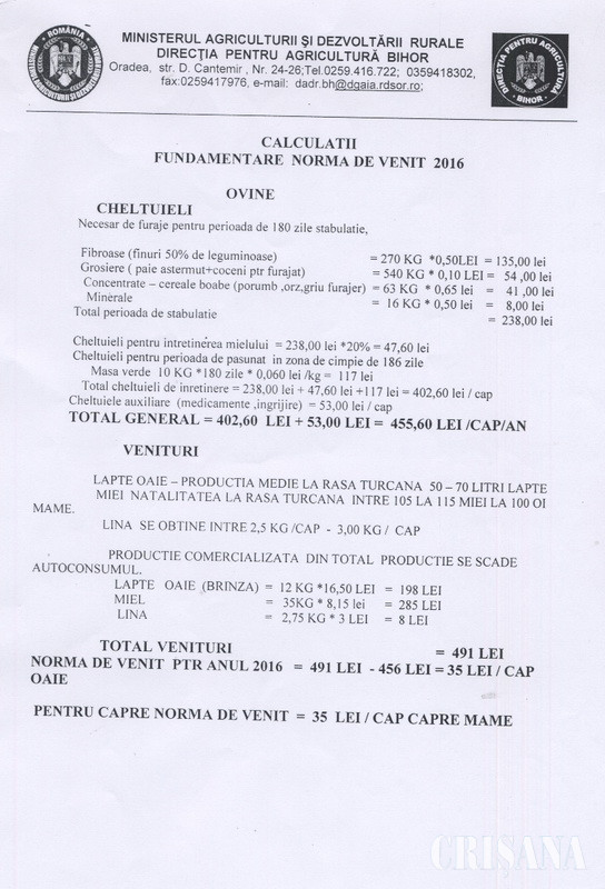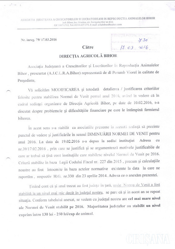"Vă solicităm modificarea şi totodată detalierea/justificarea criteriilor folosite pentru stabilirea normei de venit pentru anul 2016 având în vedere că în cadrul şedinţei organizate de Direcţia Agricolă Bihor pe data de 10 februarie 2016 s-a discutat despre problemele şi dificultăţilor financiare pe care le întâmpină fermierul bihorean”, se arată într-un memoriu către Direcţie depus de Asociaţia Judeţeană a Crescătorilor şi Lucrătorilor în Reproducţia Animalelor (AJCLRA) Bihor, reprezentată de Viorel Porumb. Asociaţia solicita diminuarea normei de venit, depunând totodată la DA Bihor adrese prin care justifica şi argumenta motivele "de care ar trebui să ţină cont instituţiile care stabilesc norma de venit”. "Conform tabelului anexat se vede că judeţul nostru are cel mai mare nivel de norme de venit stabilit pe 2016. Majoritatea judeţelor au stabilit un nivel cuprins între 130-250 lei pe cap de animal”, se arată în memoriul AJCLRA. Conform tabelului anexat, norma de venit pentru vaci (peste 2 capete), în Bihor este de 330 de lei. Doar judeţel Olt şi Dolj mai au acelaşi nivel, în timp ce judeţe apropiate Bihorului / sau comparabile, au următoarele niveluri: Arad (tot vaci peste 2 capete) 220 de lei, Cluj 249 de lei, Sălaj 95 de lei, Satu Mare 133 de lei.