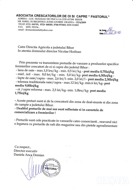 Conform adresei Asociaţiei "Păstorul”, aceste „preţuri sunt de la crescătorii din zona de deal-munte şi din zona de câmpie a judeţului”, iar preţurile "sunt reflectate şi în carnetele de comercializare ale fermierilor. Preţurile sunt cele practicate în vânzările către comercianţi, neavând nicio legătură cu preţurile de raft din magazine sau din pieţele agro-alimentare”.