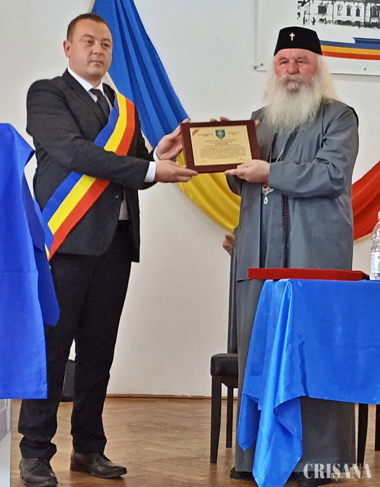 Primarul Gabriel Popa i-a înmânat apoi ierarhului născut în apropierea Beiușului, la Petrani, însemnele de Cetățean de Onoare: