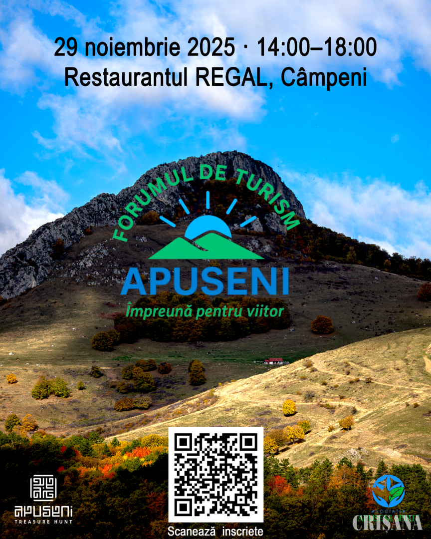 „Îmbinăm conservarea resurselor naturale cu o dezvoltare turistică inteligentă. Vom pune pe masă soluții pentru certificarea produselor locale, comunicare de mediu, finanțări și colaborare regională. Ne dorim rezultate măsurabile și o direcție clară pentru 2026”, a declarat Radu Stoica, co-organizator din partea Apuseni Treasure Hunt.