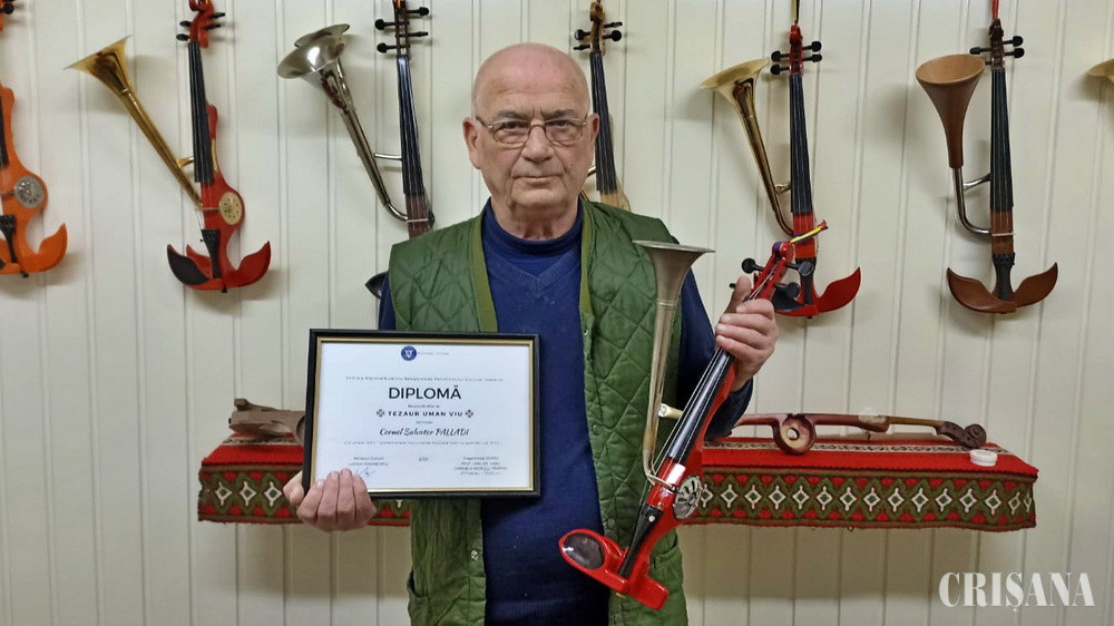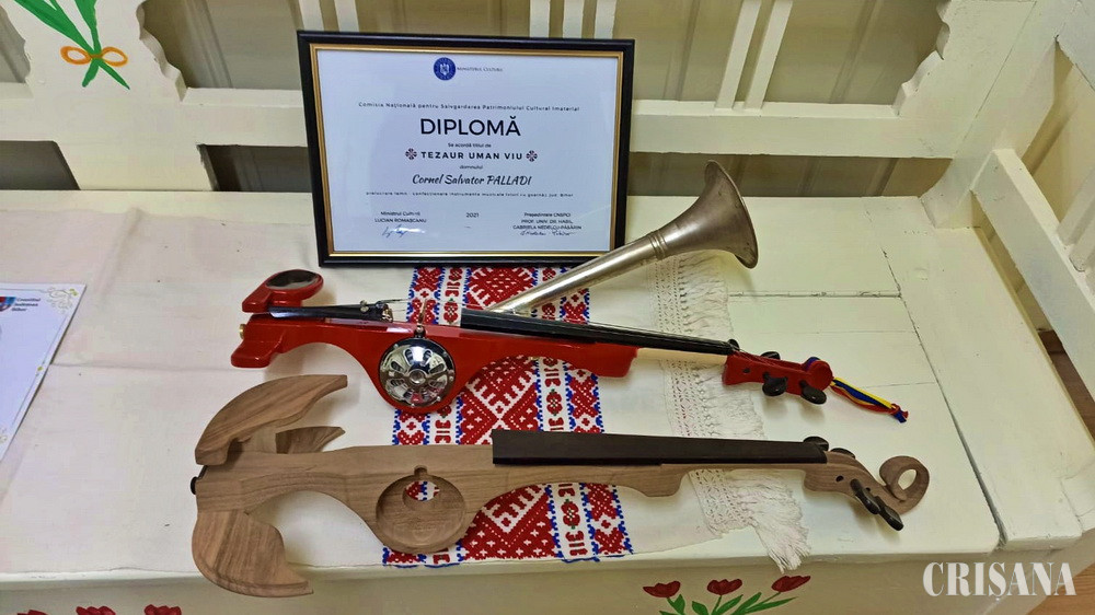 L-am vizitat pe lutierul Salvator-Cornel Palladi la puțin timp după ce a intrat în posesia diplomei care atestă noul său statut – acela de Tezaur uman viu – și l-am găsit lucrând la noi tipuri de instrumente muzicale, cea mai nouă producție a meșterului beiușean fiind o vioară cu goarnă adaptată nevoilor copiilor: