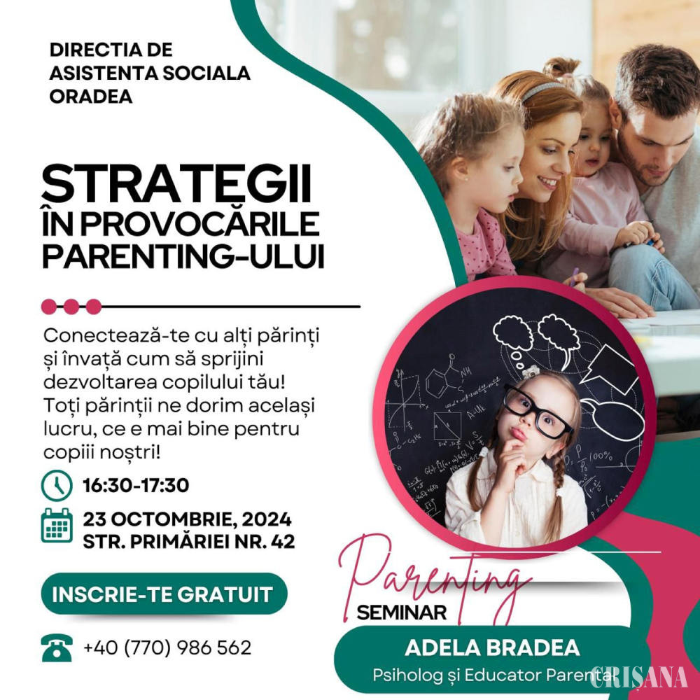 Adresat familiilor din comunitatea orădeană, cu scopul de a le sprijini să depășească, cu ajutorul specialiștilor, situațiile de viață dificile prin care trec și pentru a gestiona mai bine relația cu copiii și membrii familiei, Programul Agenda Familiei continuă și în acest an. Astfel, următoarea întâlnire, la care cei interesați sunt invitați să participe, va avea loc miercuri, 23 octombrie, ora 16.30, în sala de ședințe (mansarda), de la sediul DASO, situat pe strada Primăriei nr.42. Temele vizate în cadrul acestor seminare sunt dificultăți parentale, conflicte în creșterea copiilor, situații de viață dificile, dificultăți familiale, gestionarea conflictelor și a emoțiilor, educație financiară, educație sanitară, etc.