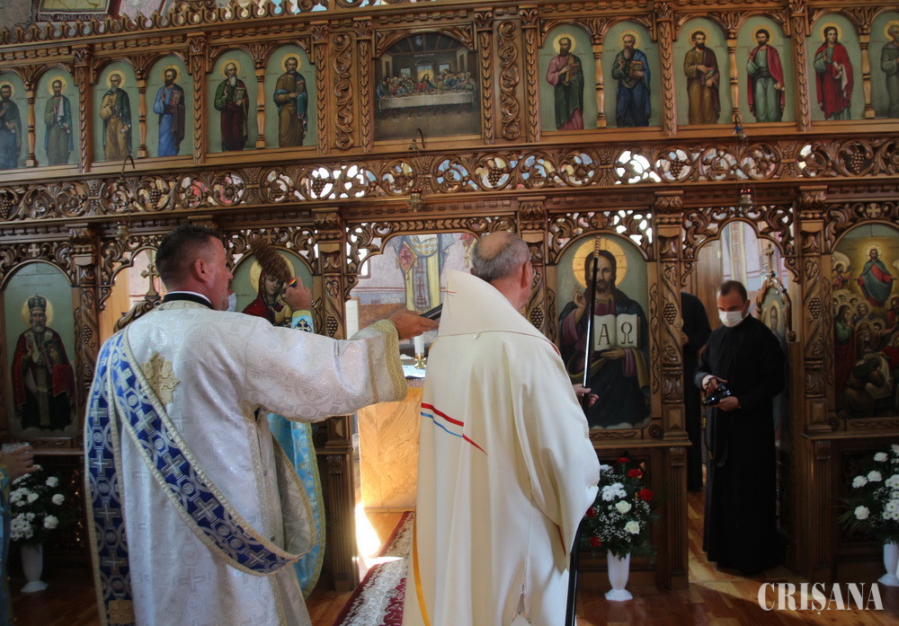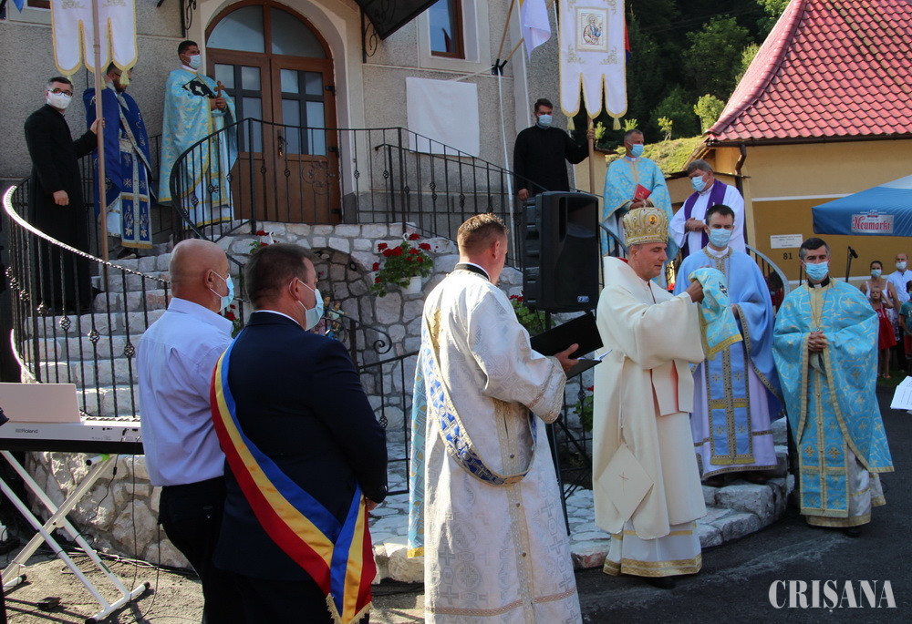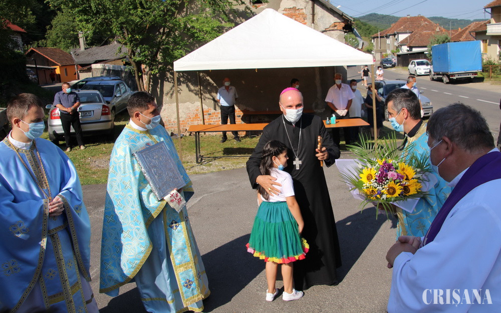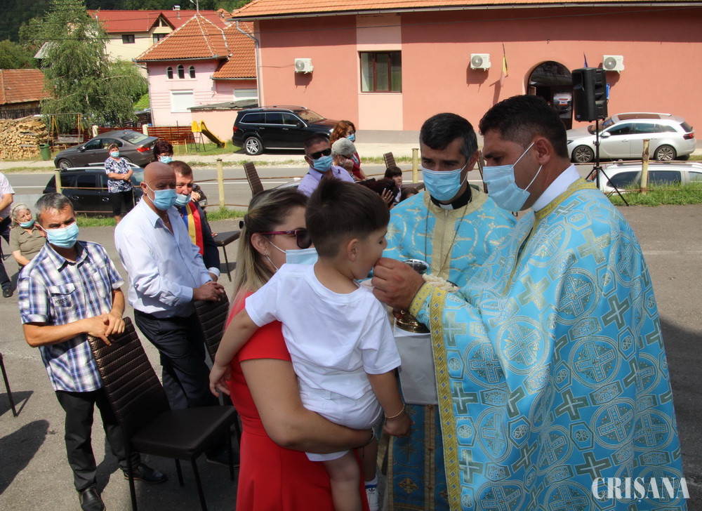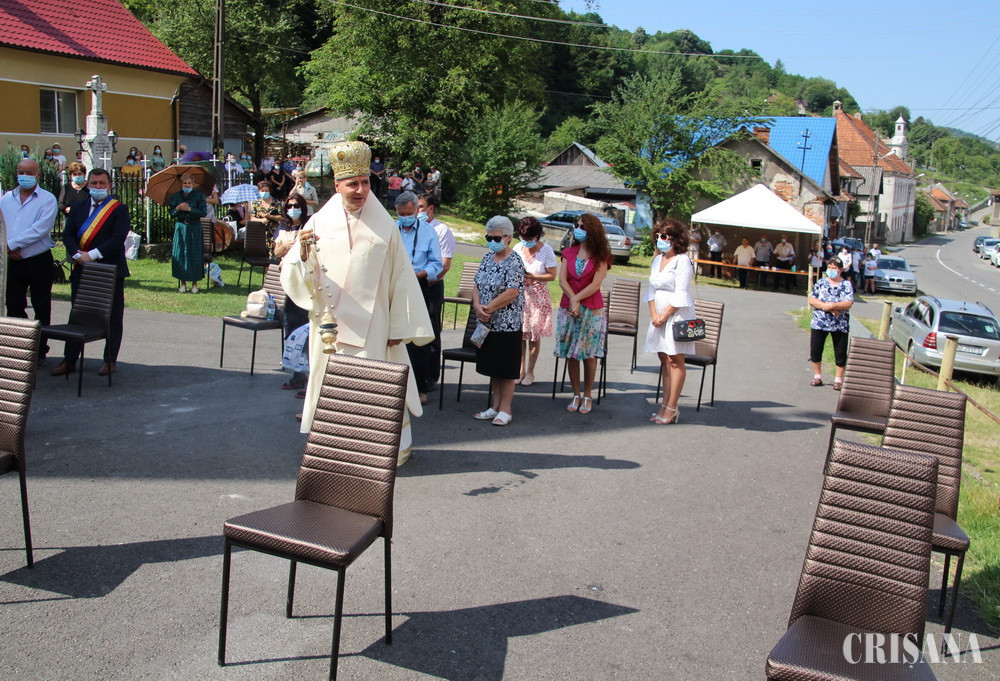 După resfințirea bisericii, prima Sfântă și Dumnezeiască Liturghie a fost săvârșită de Preasfințitul Părinte Virgil, împreună cu un sobor de preoți, printre care părintele Gheorghe Zorel Zima, protopopul greco-catolic de Beiuș, în aer liber, pe scena special amenajată cu ocazia acestui eveniment, în vecinătatea lăcașului de cult. Cuvântul de învățătură, ținut de Preasfinția Sa Virgil Bercea, a fost unul plin de dragoste emanat dintr-o iubire fără margini pentru semeni, mai ales acum într-o perioadă critică pe care omenirea trebuie să o trăiască datorită pandemiei: „În numele Domnului suntem adunați, eu am cerut să nu vină foarte multă lume. Să nu vină nici preoți foarte mulți pentru că trăim niște vremuri cu totul speciale. Este adevărat că Dumnezeu ne ajută absolut întotdeauna, dar când este vorba de ce se întâmplă acuma, de această pandemie care ne-a năpădit pe toți și nici unul nu găsește scăpare, nu are importanță în ce parte a lumii suntem, trebuie să fim totuși atenți cu noi înșine și mai ales responsabili cu cei de lângă noi. Dar dincolo de asta dacă avem credință în Dumnezeu pe de o parte și să ne protejăm, pe de alta, credem cu adevărat că putem să trecem și peste această pandemie”, punctând aspectul că: „De-a lungul vieții noastre, pe marea vieții noi nu venim din nimic și avem niște rădăcini, ci mergem înainte pentru că din aceste rădăcini ne adăpăm, iar noi suntem brazii care se pot frânge, dar nu se îndoaie niciodată. Fiți drepți dragilor, ca brazii, aveți demnitate și credeți întotdeauna că în Domnul nimic rău nu vi se poate întâmpla”.