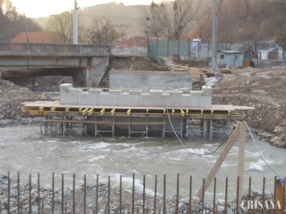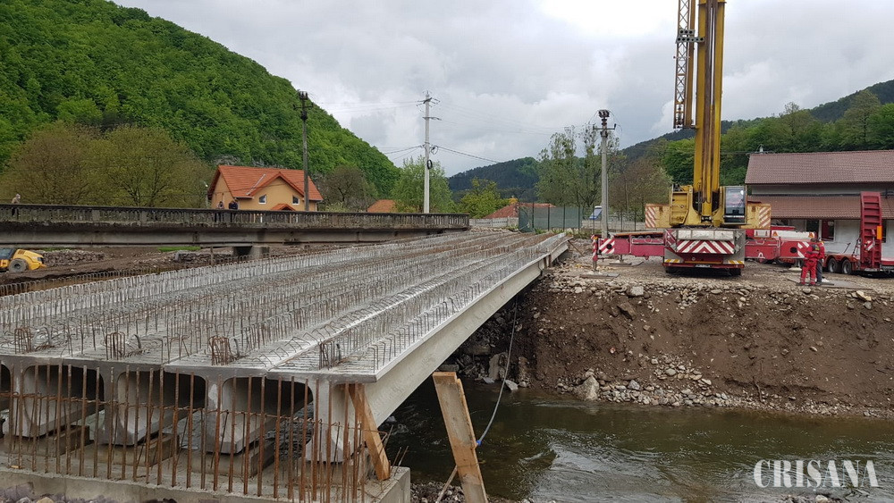 În această săptămână au fost montate cele 14 grinzi, câte șapte pe fiecare deschidere, care susțin trecerea de pe un mal pe altul pe viitorul pod peste râul Crișul Repede din localitatea Bulz.