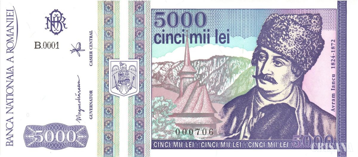 Scriam atunci: „Anul 1990 este o nouă bornă, atât în istoria noastră, cât și a monedei de hârtie și subdiviziunile ei de metal. Primii 10-15 ani au fost marcați de o inflație galopantă”. Au reapărut „milioanele” ca după Al Doilea Război Mondial (anii 1945-1953). „În acest context, (în 1992- n.n.) este bătută o bancnotă de 5000 lei având pe avers portretul lui Avram Iancu, așa cum l-a realizat pictorul muntean Barbu Iscovescu - în ianuarie 1849, în tabăra militară a moților de la Câmpeni. Chipul Iancului are în fundal o bisericuță tradițională de lemn plasată într-o zonă păduroasă. În partea stângă, avem sigla BNR, semnătura lui Mugur Isărescu ca Guvernator al BNR și cea a Casierului central. Pe reversul bancnotei, apare Poarta Carolina de intrare în Cetatea Alba Iulia, ridicată de habsburgi (unde au fost închiși Horea, Cloșca și Crișan înainte de a fi martirizați prin tragerea pe roată - n.n.), deasupra ei steagul de luptă a dacilor (Capul de lup – n.n.), alături de biserica de la Densuș (ridicată din blocuri de piatră provenite din vechi cetăți dacice și castre romane - n.n.) Deci elemente semnificative din istoria Transilvaniei românești, cu care Avram Iancu și generația lui s-au identificat: În fine, reapare sigla BNR și o inscripție prin care se avertizează că falsificarea acestui bilet se pedepsește conform legilor în vigoare”.