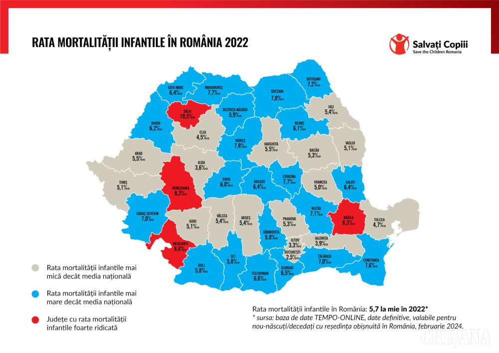 Rata mortalității infantile urcă din nou, la 5,7 la mia de copii născuți vii, față de 5,2 anul anterior, cu un vârf în județul Sălaj - 10,5 la mia de copii născuți vii - și un minim pentru Municipiul București - 2,5 la mie, ceea ce consacră disparitățile uriașe care există în țară.