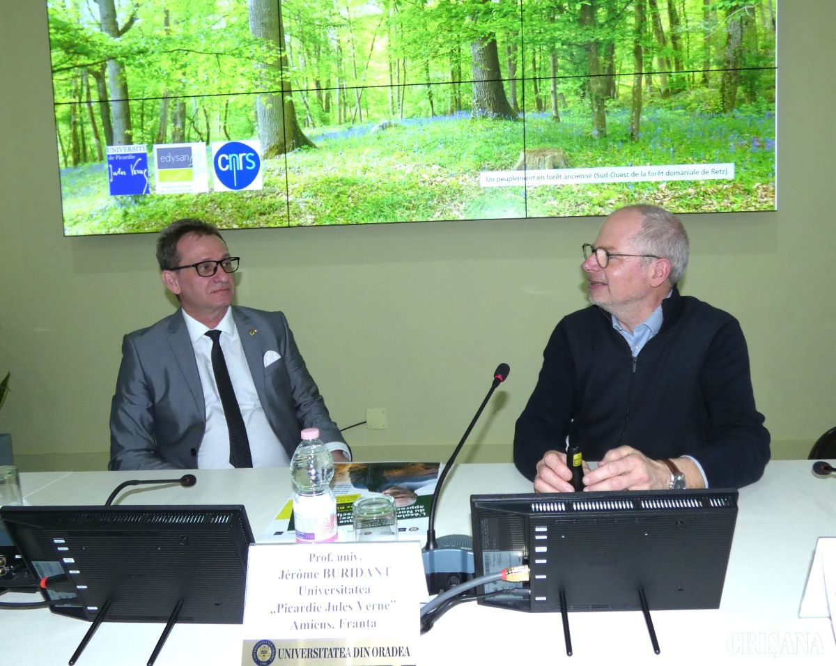 Profesorul Jerome Buridant a precizat că munca sa de cercetare a pornit de la nevoia de a determina efectul schimbărilor climatice asupra pădurilor situate la nord de Paris. Pentru aceasta, universitarul din Amiens a început cu cercetări de arhive, descoperind că „cele mai vechi surse istoriografice care vorbesc despre pădurile regale și nobiliare din zonă datează din 1291”. După o scurtă trecere în revistă a evoluției suprafețelor forestiere ce fac obiectul cercetărilor sale, profesorul Buridant a prezentat descoperirile făcute de el prin scanarea terenurilor de la înălțime, cu ajutorul sistemului LiDAR. Este vorba de vile romane, drumuri, furnale din sec. XVI dar și cuptoare pentru producția de cărbune care au continuat să funcționeze până la începutul secolului trecut. Prin alte metode, cum ar fi sondarea arheologică sau analizele de sol, echipa interdisciplinară condusă de universitarul francez a descoperit cioburi și amenajări de vânătoare din evul mediu dar și importante zone poluate cu metal în timpul primului război mondial. În concluzie, a spus oaspetele Universității din Oradea, pădurile s-au schimbat enorm de-a lungul timpului, suferind mai ales din pricina exploatării intensive, consecințele acesteia fiind vizibile până astăzi. Jerome Buridant a mai subliniat că metodele moderne folosite de el și implicarea echipelor interdisciplinare în cercetarea acestor arealuri forestiere oferă o viziune completă și complexă asupra evoluției suprafețelor studiate.