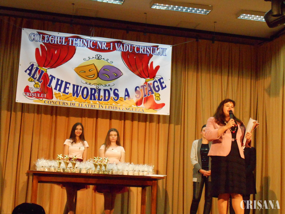 La prima ediţie a concursului de teatru în limba engleză „All the world's a stage” au participat şase gimnazii și patru licee. Astfel, la Secţiunea gimnazii au participat: Școala Aştileu, prof. Olivia Feher; Școala „Nicolae Popoviciu” Beiuș, prof. Mariana Pălcuțiu; Liceul Tehnologic Șuncuiuș, prof. Livia Straton; Colegiul Tehnic Vadu Crișului, prof. Tunde Crăciun şi Bernath Ildiko; Școala „Belasko Nandor” Sălacea, prof. Miklosicza Katalin; Școala Tămășeu, prof. Bognar Mihaela Ildiko și Varkucz Robert. La Secţiunea liceu au participat: Liceul „Constantin Șerban” Aleșd, prof. Andreea Lazăr; Liceul Vocațional Pedagogic „Nicolae Bolcaș” Beiuș, prof. Amelia Șerb şi Ioan Grigoraș; Liceul Teoretic Bratca, prof. Ioana Sturz; Colegiul Tehnic Vadu Crișului, prof. Gabriela Lazăr şi Roxana Fildan. În discursul inaugural rostit de prof. Roxana Fildan, din partea organizatorilor concursului, se precizează: „Ideea acestui proiect a venit din dorința de a valorifica și de a expune într-un cadru mai amplu munca depusă de fiecare cadru didactic pe parcursul orelor de studiu și de a încuraja elevii să se implice în activitatea școlară și extrașcolară. Astfel, proiectul nostru constituie o oportunitate pentru elevi de a participa la un concurs de limbă engleză prin intermediul teatrului. Activitatea propusă are rolul de a sensibiliza elevii față de învățarea limbii engleze într-un mod creativ și plăcut, urmărind valorizarea potențialului artistic al copiilor prin punerea în scenă a unor piese de teatru în limba engleză.” Din argumentul proiectului am desprins ideile ce sunt transformate în beneficii: asimilarea pronunției în context, îmbogățirea vocabularului și dezvoltarea încrederii în sine. Teatrul este o artă complexă, care creează o mare deschidere și bucurie copiilor. Se creează un cadru favorabil exprimării personalității fiecărui elev, stimularea spiritului de echipă, adaptarea la cerințele scenei, afirmând o atitudine lipsită de emoții. Această formă de activitate se distanțează față de transmiterea formală de informații, asigură spațiu învățării bazată pe descoperire, experimentare, asigură spațiu pentru diversitate, idei, inițiativă, fantezie. O astfel de activitate asigură succesul în predarea limbii engleze, sporește motivația de învățare. În vederea departajării, s-a încredințat sarcina unui juriu de specialiști: conf. univ. dr. Dana Sala, președinte, Drăgoi Eugenia, artist plastic Oradea, Lakatos Zentania, actriță la teatrul Arcadia Oradea, prof. Ioan Popescu și prof. Mădălina Gavriș. Organizatorilor li s-au alăturat sponsorii, care au făcut posibilă organizarea acestuia inedit concurs: Consiliul Județean Bihor, prin consilierul Mateiaș Julien, care a finanțat premiile în bani, în valoare de 3.000 lei, Primăria Vadu Crișului, Colegiul Tehnic etc. Ținând cont de efortul depus în pregătirea și prezentarea acestor scenete, juriul a oferit tuturor trupelor premii constând în diplome și mici obiecte ceramice specifice zonei. La Secţiunea Gimnaziu s-au acordat următoarele premii: Premiul I – Colegiul Tehnic Vadu Crișului; Premiul II - Școala Gimnazială Sălacea; Premiul III - Liceul Tehnologic Șuncuiuș. Premii speciale: Cel mai bun actor - Lazăr Nonuț (Șuncuiuș), Cea mai bună actriță - Gavriluț Medeea (Vadu Crișului), Cel mai reușit decor și costume - Școala Gimnazială Beiuș, Premiul special pentru regie și concepție artistică - Școala Gimnazială Aștileu, Premiul pentru originalitate - Școala Gimnazială Tămășeu. La Secţiunea Liceu, premiile au fost următoarele: Premiul I - Liceul Pedagogic „Nicolae Bolcaș” Beiuș; Premiul II - Liceul Teoretic Bratca; Premiul III - Liceul Teoretic „Constantin Șerban” Aleșd. Premii speciale: Cel mai bun actor - Ruben Pancu (Beiuș), Cea mai bună actriță - Fabian Bianca (Vadu Crișului), Premiul special pentru costume și decor - CT Vadu Crișului. Conf. univ. dr. Dana Sala a felicitat echipa de proiect alcătuită din: Gabriela Lazăr, Roxana Fildan, Florina Tecsi, Mihaela Gavriluț, Maier Zoltan, Maria Mălai, Liana Boț, Tunde Crăciun și Bernath Ildiko. Despre concurs și realizările sale, ea a remarcat provocarea de a învăța limba engleză, dezvoltarea pasiunii pentru teatru, descoperirea talentelor și a resurselor nebănuite, îndepărtarea elevilor de calculator și telefonul mobil și de viața virtuală. Surprinde neparticiparea școlilor din Oradea.
