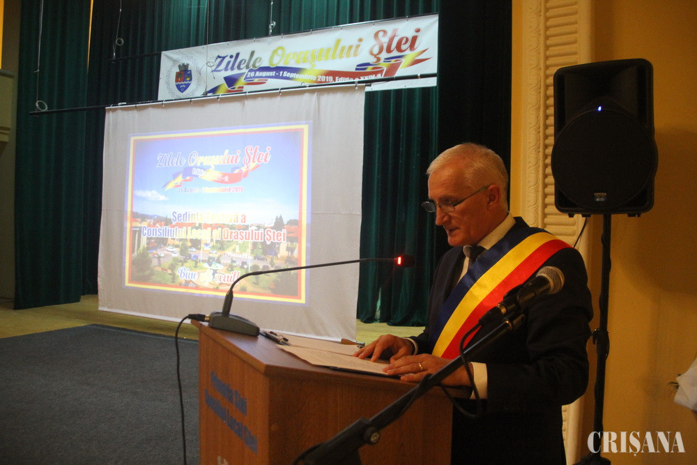 În sala mare a Casei de Cultură a avut loc, de la ora 16.00, Ședința Festivă a Consiliului Local care a avut pe ordinea de zi cuvântul primarului Iulian Balaj; mesajele către invitați; decernarea titlului de „Cetățean de onoare al orașului Ștei”; premierea cuplurilor care au împlinit 50 de ani de căsătorie. Au participat atât oameni din mediul de afaceri, cât și din cel politic, printre care am remarcat prezența senatorului Cornel Popa, a deputaților Gavrilă Ghilea și Ioan Cupșa, a consilierului județean Ionel Avrigeanu, precum și a primarilor și viceprimarilor din orașele și comunele învecinate. Au fost acordate titlul de „Cetățean de onoare al orașului Ștei” doamnei Maria Feczko, din domeniul culturii, iar din domeniul sănătății, domnului ec. Radu Aron, directorul Spitalului orășenesc Ștei, precum și celor din lumea sportului, Raluca Jude, Călin Bara, Sebastian Indrei, Voicu Popa, Alin Pașca, Răzvan Fărcanea. Au fost premiate cele cinci cupluri, Marinescu Ion și Casița, Meșter Nicolae și Antița, Balla Mihai-Coloman și Serina, Iuga Ion și Maria, Tamaș Ioan și Rodica, care și-au sărbătorit „Nunta de Aur”. La finalul ședinței, pe holul Casei de Cultură, cei prezenți au participat la o lansare de carte a cunoscutului scriitor bihorean avocat Pașcu Balaci, dar au și vizitat o expoziție de pictură.
