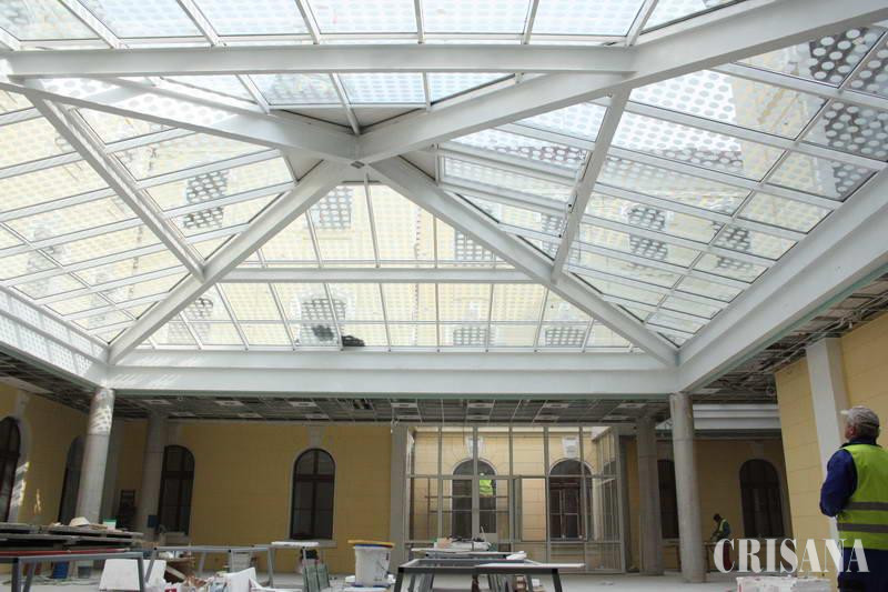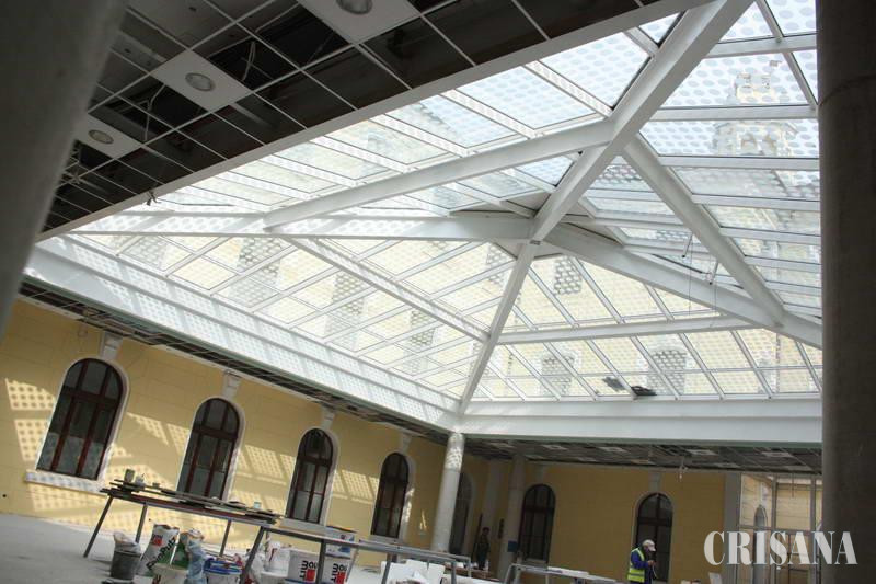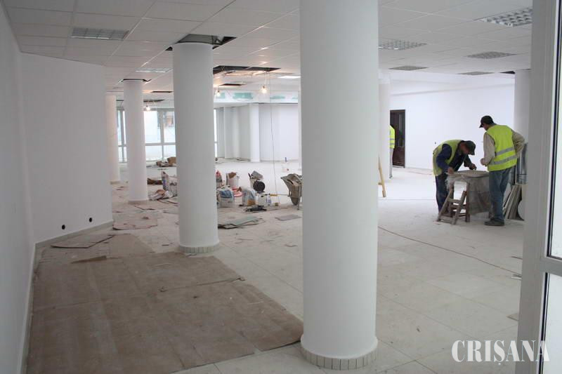 Vineri, muncitorii lucrau la zugrăvirea pereţilor, finisarea stălpilor şi executau vopsitorii la ferestrele din lemn existente. În această săptămână, va începe montarea parchetului din lemn triplustratificat din sala cu publicul. Proiectul prevede amenajarea la subsol a unui spaţiu pentru sala de mese, care va avea o capacitate de 76 de locuri, cu anexe pentru preparare şi depozitare, grupuri sociale etc. La parter, spaţiul pentru public va adăposti o masă de recepţie care va asigura concomitent 34 de posturi de relaţii cu publicul şi încă 50 de locuri de aşteptare. Valoarea lucrărilor contractate este de 1.299.991 lei, plus TVA, însă, din cauza unor lucrări în plus, se va suplimenta valoarea iniţială. Una dintre cele mai dificile operaţiuni a fost montarea celor 88 de geamuri termopan. Acestea au un model cu cercuri prelucrat prin sablare.