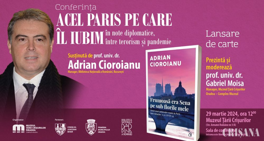 Conferinţa va fi urmată de lansarea volumului „Frumoasă era Sena pe sub florile mele. Notele unui ambasador român la Paris între Bataclan ’15 și Covid-19”, Editura Curtea Veche Publishing, 2023, autor Adrian Cioroianu. Evenimentul va avea loc vineri, 29 martie, ora 12.00, în sala de conferințe a Muzeului Țării Crișurilor și va fi moderat de prof. univ. dr. Gabriel Moisa, managerul instituției muzeale orădene.