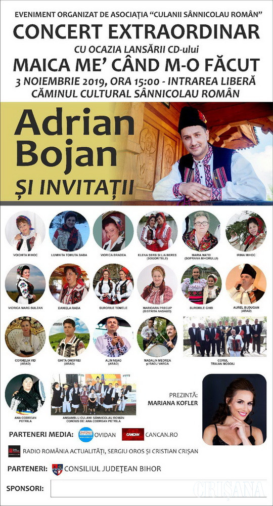 Ziua de 3 noiembrie va încununa, pentru solistul de muzică populară Adrian Bojan, nu mai puțin de şase ani de stăruință și muncă. Acesta își va lansa albumul de debut intitulat „ Maica me când m-o făcut”, în cadrul unui eveniment organizat de Asociația Culanii Sânnicolau Român, din localitatea cu acelaşi nume, satul natal al interpretului.