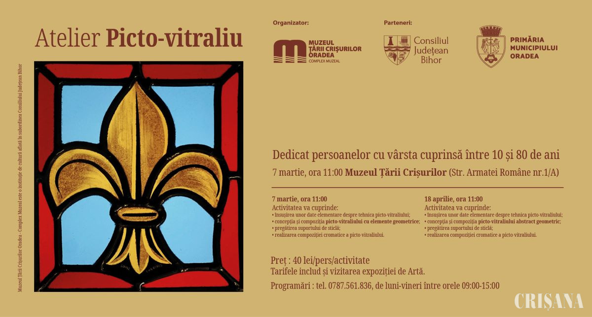 Dedicat persoanelor cu vârsta cuprinsă între 10 și 80 de ani, atelierul „Picto-vitraliu” va avea loc în 7 martie și 18 aprilie, la Muzeul Țării Crișurilor.