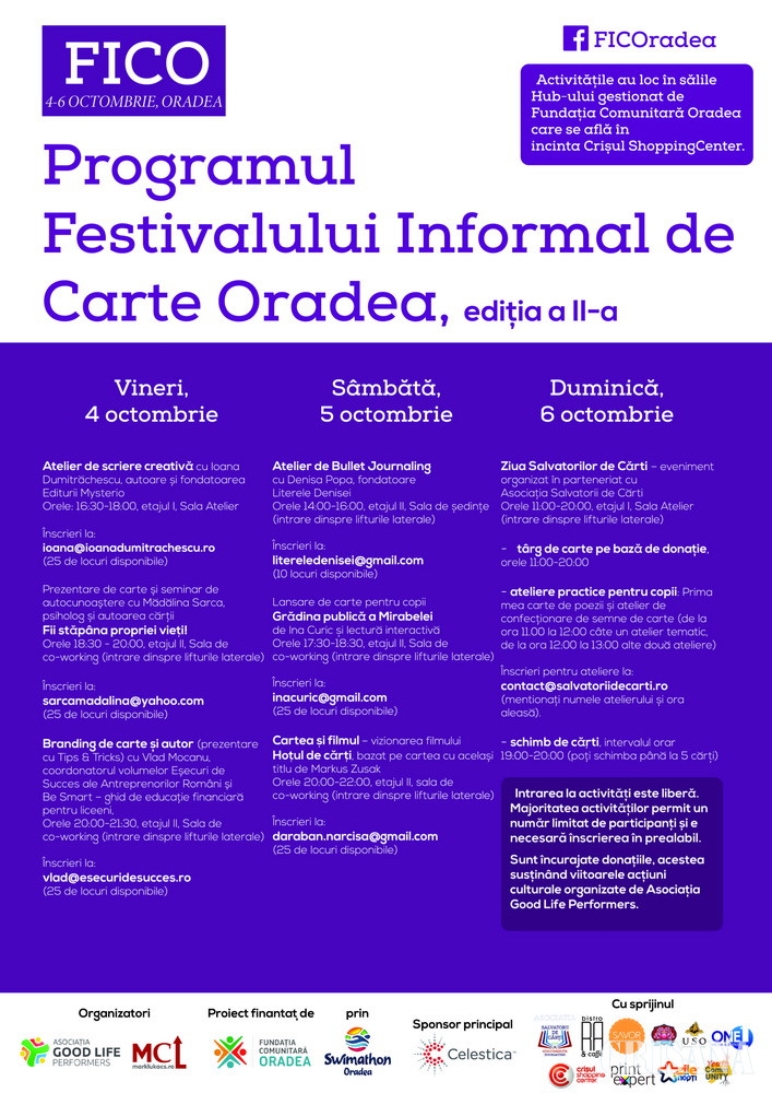 Exceptând târgul de carte, activitățile din cadrul FICO vor avea loc în sălile Hub-ului gestionat de Fundația Comunitară Oradea care se află în incinta Crișul Shopping Center.