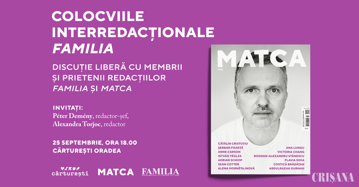 Revista de cultură Familia invită cititorii astăzi, 25 septembrie, la librăria Cărturești (din Lotus Center), unde, începând cu ora 18.00, va avea loc lansarea numărului #6 al revistei Matca, în cadrul Colocviilor interredacționale Familia. Evenimentul se va desfășura în prezența membrilor și prietenilor celor două redacții. Invitați din partea revistei Matca sunt Péter Demény (redactor-șef) și Alexandra Torjoc (redactor).