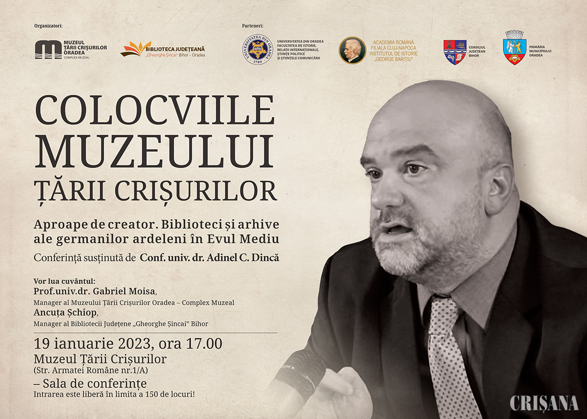 La Muzeul Ţării Crişurilor are loc azi, 19 ianuarie, de la ora 17.00, conferința „Aproape de creator. Biblioteci și arhive ale germanilor ardeleni în Evul Mediu”, ce prezintă fondul de carte adăpostit de biserica parohiei luterane Sf. Margareta din Mediaș.
