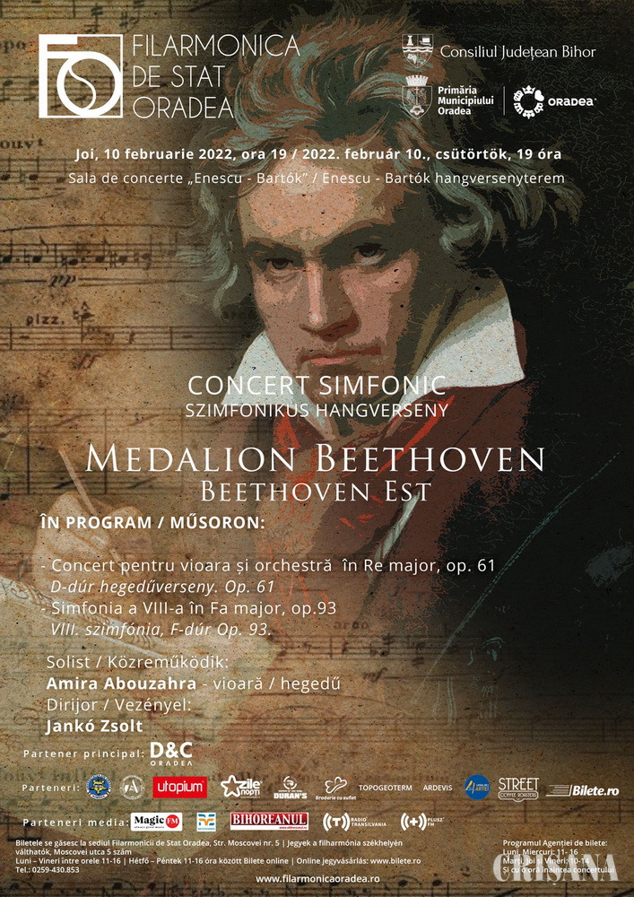 Filarmonica Oradea invită melomanii la un nou concert simfonic, compus din lucrările titanului de la Bonn, Medalionul Beethoven va avea loc joi, 10 februarie, la ora 19.00, în Sala „Enescu - Bartókˮ.