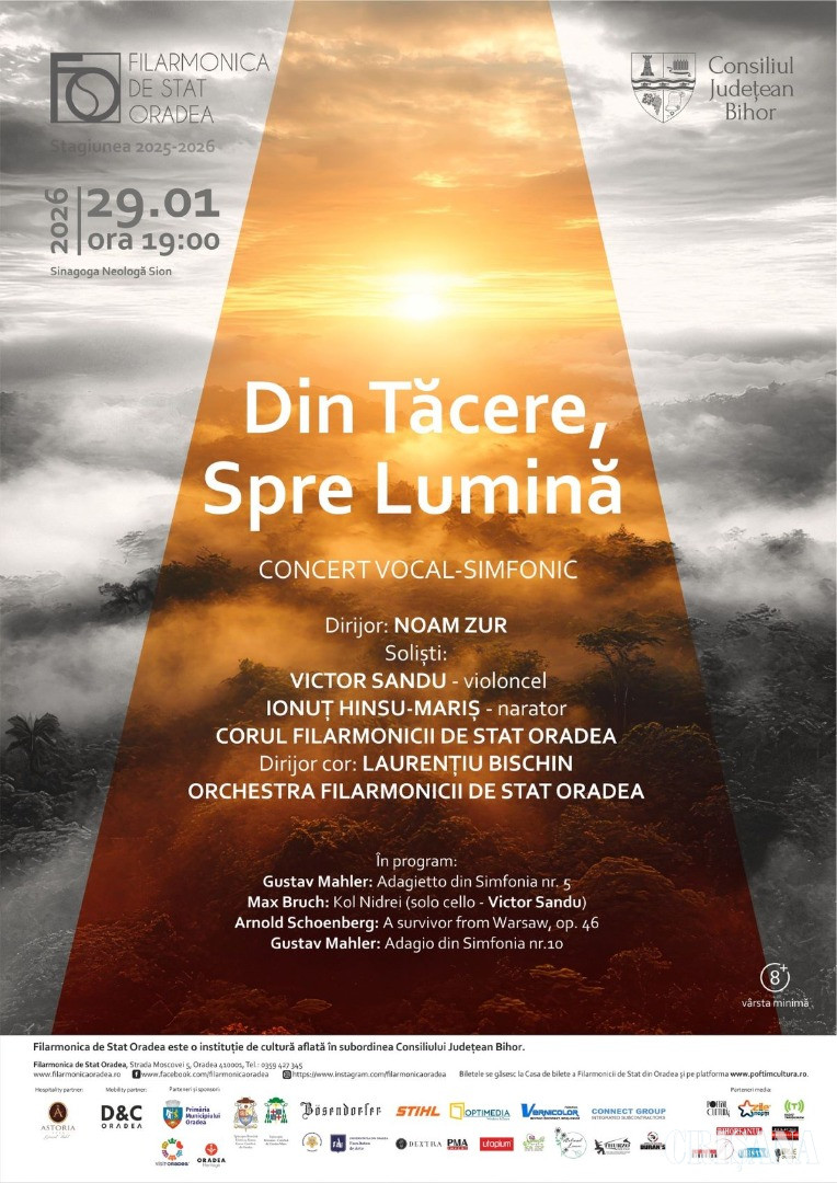 Concertul de joi, 29 ianuarie, de la ora 19.00, îl va avea ca dirijor pe Noam Zur, căruia i se vor alătura Corul și Orchestra Filarmonicii de Stat Oradea, violoncelistul Victor Sandu și naratorul Ionuț Hinsu-Mariș.