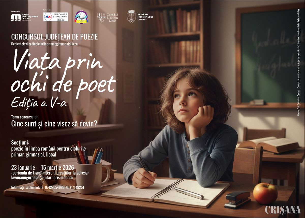Muzeul Țării Crișurilor Oradea - Complex Muzeal organizează, împreună cu Inspectoratul Școlar Județean Bihor și Casa Corpului Didactic a Județului Bihor și în parteneriat cu Consiliul Județean Bihor și Primăria Municipiului Oradea, concursul județean de poezie „Viața prin ochi de poet”, ediția a V-a, înscris în Calendarul activităților educative județene.