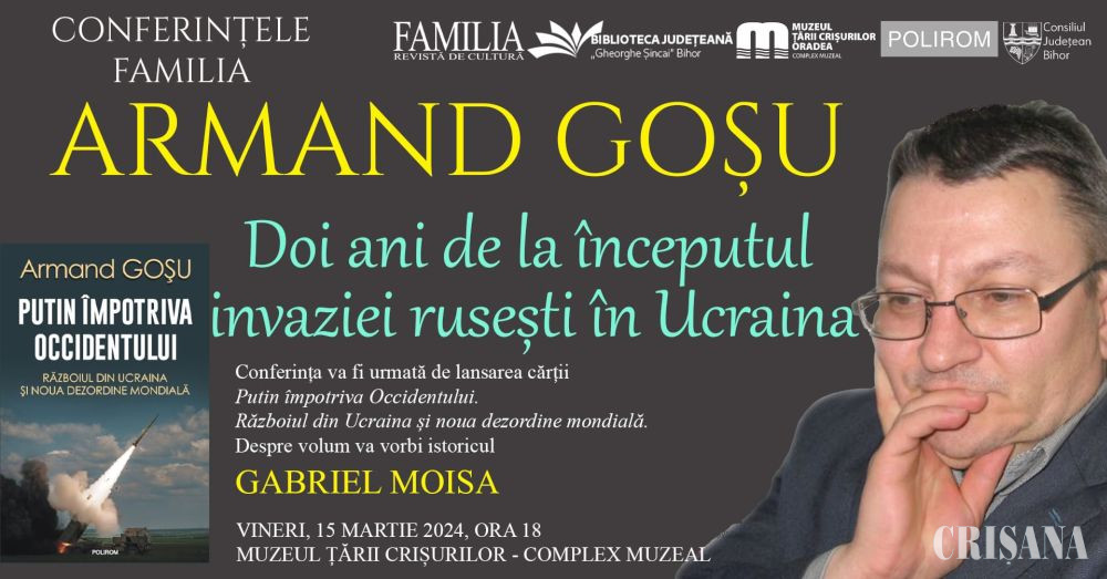 Revista „Familia” și Biblioteca Județeană „Gheorghe Șincai” Bihor, în colaborare cu Editura Polirom, Muzeul Țării Crișurilor – Complex Muzeal și Librăria Humanitas Oradea, organizează vineri, 15 martie, ora 18.00, în amfiteatrul Muzeului Țării Crișurilor, o întîlnire culturală de excepție. Astfel, în cadrul seriei „Conferințele Familia” va fi prezent unul dintre cei mai importanți istorici și analiști politici ai Estului european, specialist în evoluțiile din spațiul ex-sovietic, în regimul Putin și în istoria invaziei, acoperind deja doi ani, rusești în Ucraina, Armand Goșu. Acesta va susține conferința „Doi ani de la începutul invaziei rusești în Ucraina. Cauzele, etapele și consecințele agresiunii Rusiei”. Conferința va fi dublată de lansarea celei mai recente sale cărți, apărută la sfârșitul anului trecut la Editura Polirom, „Putin împotriva Occidentului. Războiul din Ucraina și noua dezordine mondială”. Volumul va fi prezentat și analizat de istoricul Gabriel Moisa. Evenimentul se va încheia printr-un dialog deschis cu publicul prezent și cu o sesiune de autografe.