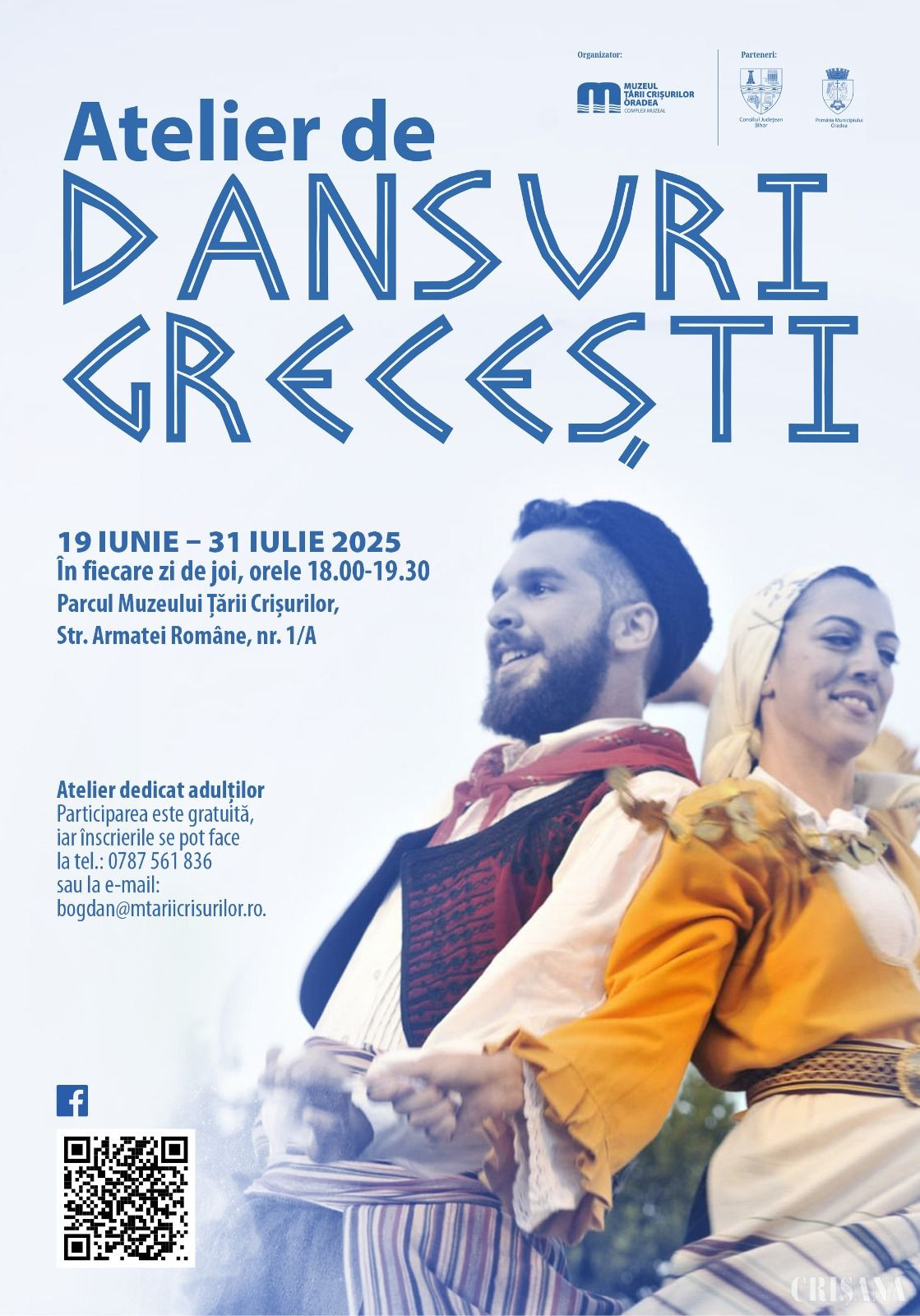 Cursul se adresează adulților pasionați de dans și de tradițiile Greciei, atât celor cu experiență în dans, cât și celor fără experiență, și va avea loc săptămânal, în fiecare zi de joi, în perioada 19 iunie - 31 iulie, între orele 18.00 și 19.30, la sediul Muzeului Țării Crișurilor, cu minimum cinci persoane.