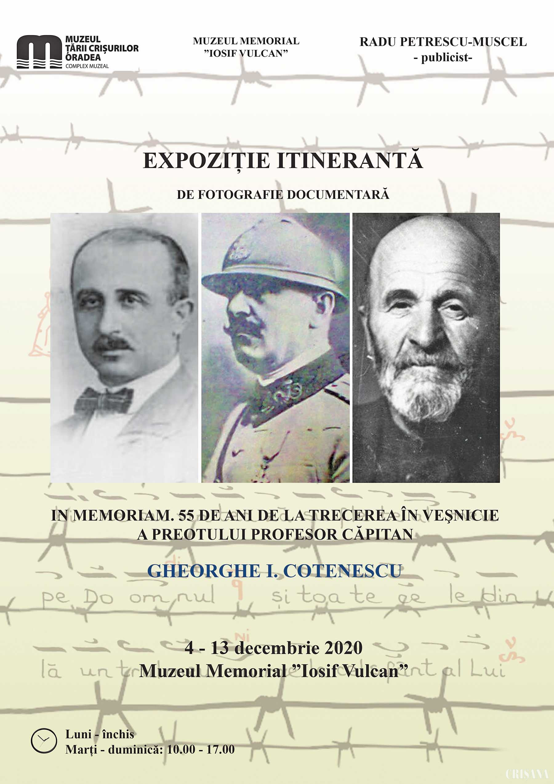 Începând din data de 4 decembrie 2020, Muzeul Memorial „Iosif Vulcan”, din cadrul Muzeului Țării Crișurilor – Complex Muzeal, va găzdui expoziția fotodocumentară intitulată „In memoriam. 55 de ani de la trecerea în veșnicie a preotului profesor căpitan Gheorghe I. Cotenescu”.