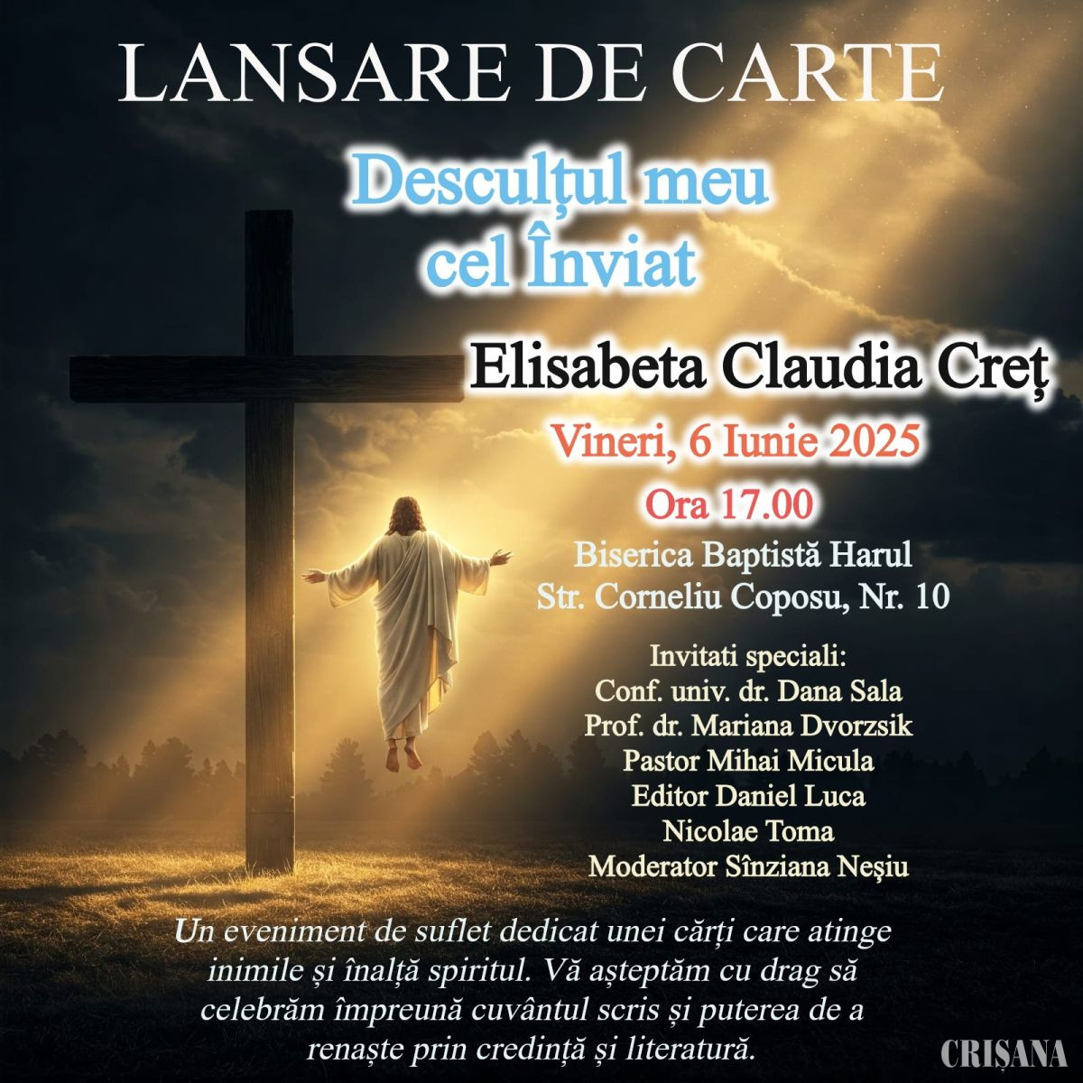 Vineri, 6 iunie, de la ora 17.00, la Biserica Baptistă „Harul”, lângă Orășelul Copiilor, Rogerius , Oradea, va avea loc lansarea volumului de poezii „Desculțul meu cel Înviat”, scris de prof. Elisabeta Claudia Creț.