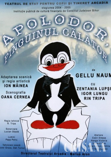 Aventurile pinguinului Apolodor au prins viața, prima dată, pe scena Teatrului Regina Maria, avându-i în distribuție pe actorii Corina Cernea și Igor Lungu. În anul 2005, maestrul Ion Mâinea decide să transfere spectacolul în palmaresul Teatrului Arcadia, refăcând distribuția cu Zentania Lupșe, Igor Lungu și Rin Tripa. Textul hazliu și sensibil deopotrivă, mesajul profund și ritmul antrenant fac din „Apolodor, pinguinul călător” un spectacol fără vârstă, care cucerește generații de copii, indiferent de spațiu și timp. Astfel, directorul artistic al trupei Arcadia, Sebastian Lupu, care semnează și coordonarea artistică a spectacolului, a decis să-i dea acestui proiect un suflu nou, perfect adaptat zilelor noastre.