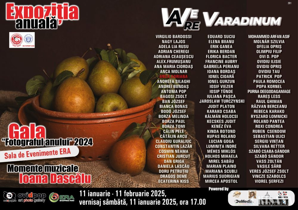 În Sala de evenimente din Era Park Oradea și Galeria Ovi D. Pop ArtPhoto Gallery, sâmbătă, 11 ianuarie, de la ora 17.00, va avea loc vernisajul expoziției anuale de fotografie „We are Varadinum 2024”, a membrilor Varadinum Foto Club Oradea, Romania, cu ocazia Zilei Artei Fotografice în România.