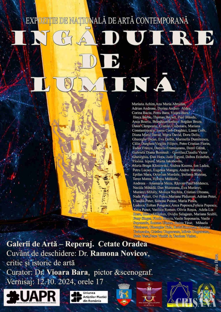 Sâmbătă, 12 octombrie, de la ora 17.00, la Galerii de Artă - Reperaj. Cetatea Oradea, va avea loc Expoziția Națională de Artă Contemporană, intitulată „Îngăduire de lumină”. Critic: Ramona Novicov, curator: Vioara Bara.