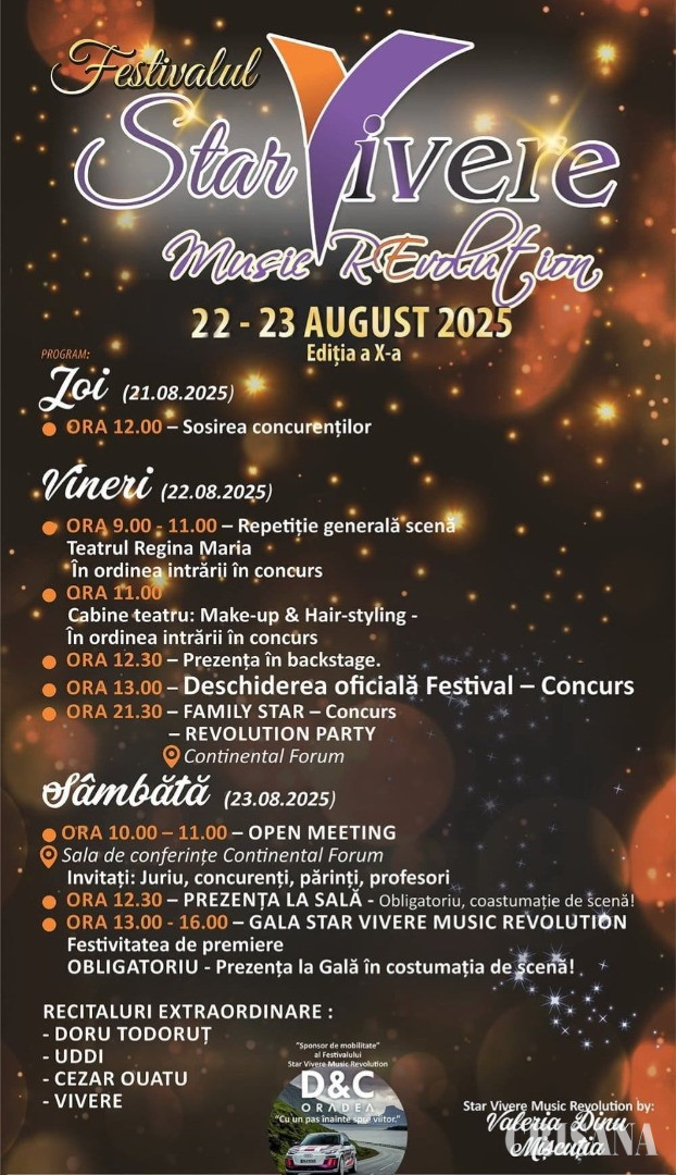 Asociația Star Vivere organizează, în perioada 22.08.2025-23.08.2025, cea de a X-a ediție a Festivalului de muzică pop pentru copii și adolescenți, „Star Vivere Music Revolution”.