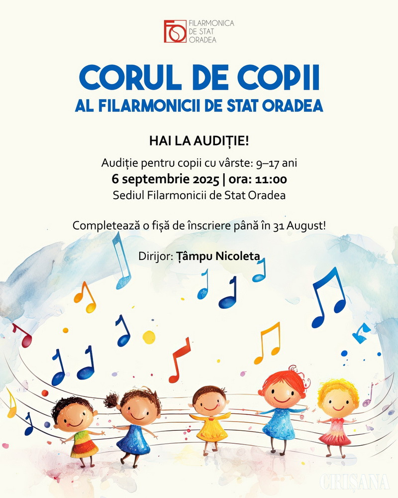 Audiția pentru Corul de Copii al Filarmonicii de Stat Oradea va avea loc în 6 septembrie, începând cu ora 11.00, la sediul instituției. Se pot înscrie fete cu vârste între 9 și 17 ani și băieți cu vârsta între 9 și 13 ani, care au înclinații muzicale, voce curată, ritm și, mai ales, entuziasm și dorința de a evolua într-un cadru artistic profesionist.