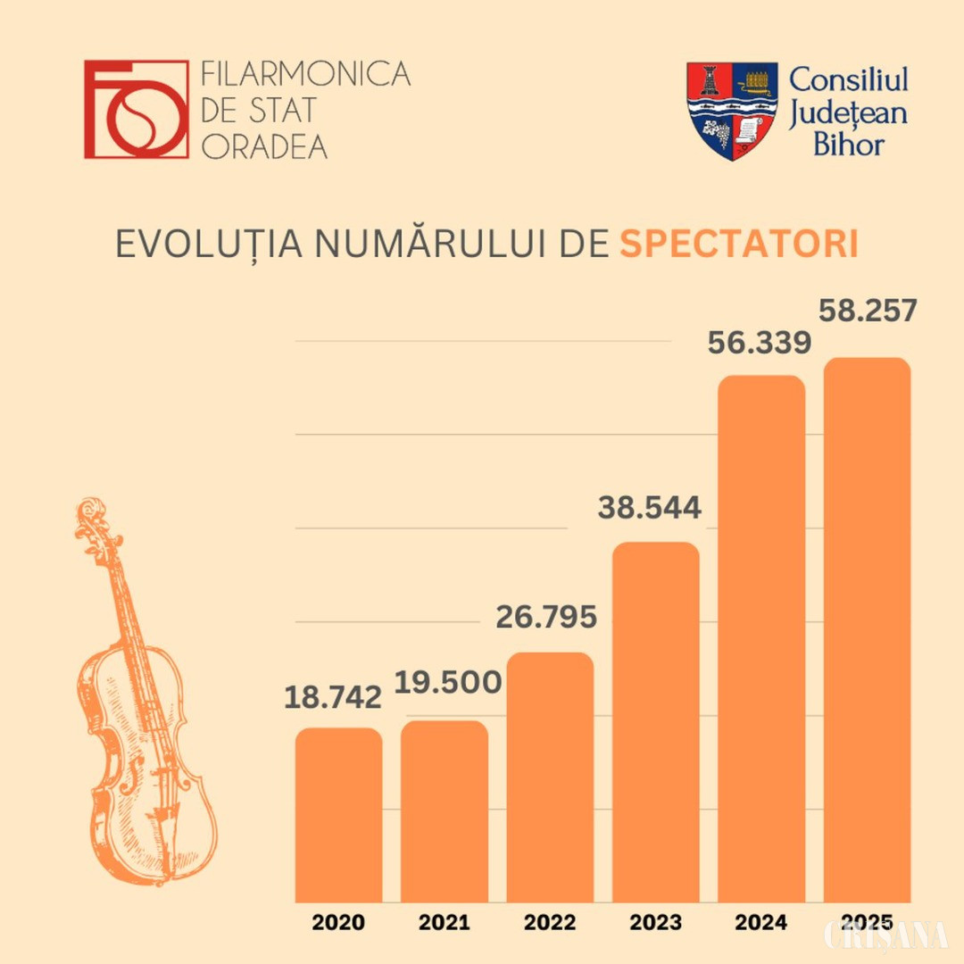 Raportul a evidențiat creșterea numărului de beneficiari cu aproape 2.000 față de anul 2024, într-un context în care oferta de evenimente în Oradea este tot mai diversă. În anul 2025, Filarmonica de Stat Oradea a organizat peste 120 de evenimente: concerte în sala Enescu – Bartók din sediul instituției, spectacole în piețe publice, dar și spectacole educative și caritabile. La toate evenimentele filarmonicii au participat 58.257 de persoane, față de 56.339 în 2024.