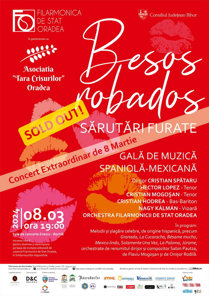 Ziua de 8 martie este declarată Ziua internațională a femeii din anul 1977 și este celebrată pe întreg mapamondul, femeile sărbătorindu-și aniversarea, iar bărbații bucurându-se de femeile din viața lor. Concertul Filarmonicii de Stat Oradea de vineri, 8 martie, este intitulat „Besos robados” (Sărutări furate) și este susținut de trei soliști renumiți din Cluj-Napoca, alături de violonistul Nagy Kálmán și dirijorul Cristian Spătaru. Chiar dacă nu fac o trimitere directă la Ziua Femeii, piesele alese cu grijă din repertoriul spaniol pot fi o dedicație din partea domnilor către doamne. Cu atât mai mult, prezența unor asemenea invitați în concertul Filarmonicii aduce melodiile spaniole mai aproape de inimile doamnelor și a tuturor melomanilor și face ca „Sărutările furate” să nu mai fie doar un titlu, ci un vis devenit realitate la Filarmonică. Cei trei soliști care vor urca pe scenă le vor bucura pe doamne și îi vor inspira pe domni sunt Tenorii Hector Lopez și Cristian Mogoșan și bas-baritonul Cristian Hodrea. Programul este unul pasional, energic, fierbinte, cu sonorități ce vor aduce Spania mai aproape. Vor putea fi auzite cântece precum: ,,Granada”, „La Cucaracha”, „Bésame mucho”, „Mexico lindo”, „Solamente Una Vez”, „La Paloma”, „Júrame”, în orchestrații ale renumitului dirijor și compozitor Sabin Pautza, dar și ale lui Flaviu Mogoșan și Onișor Rodilă.